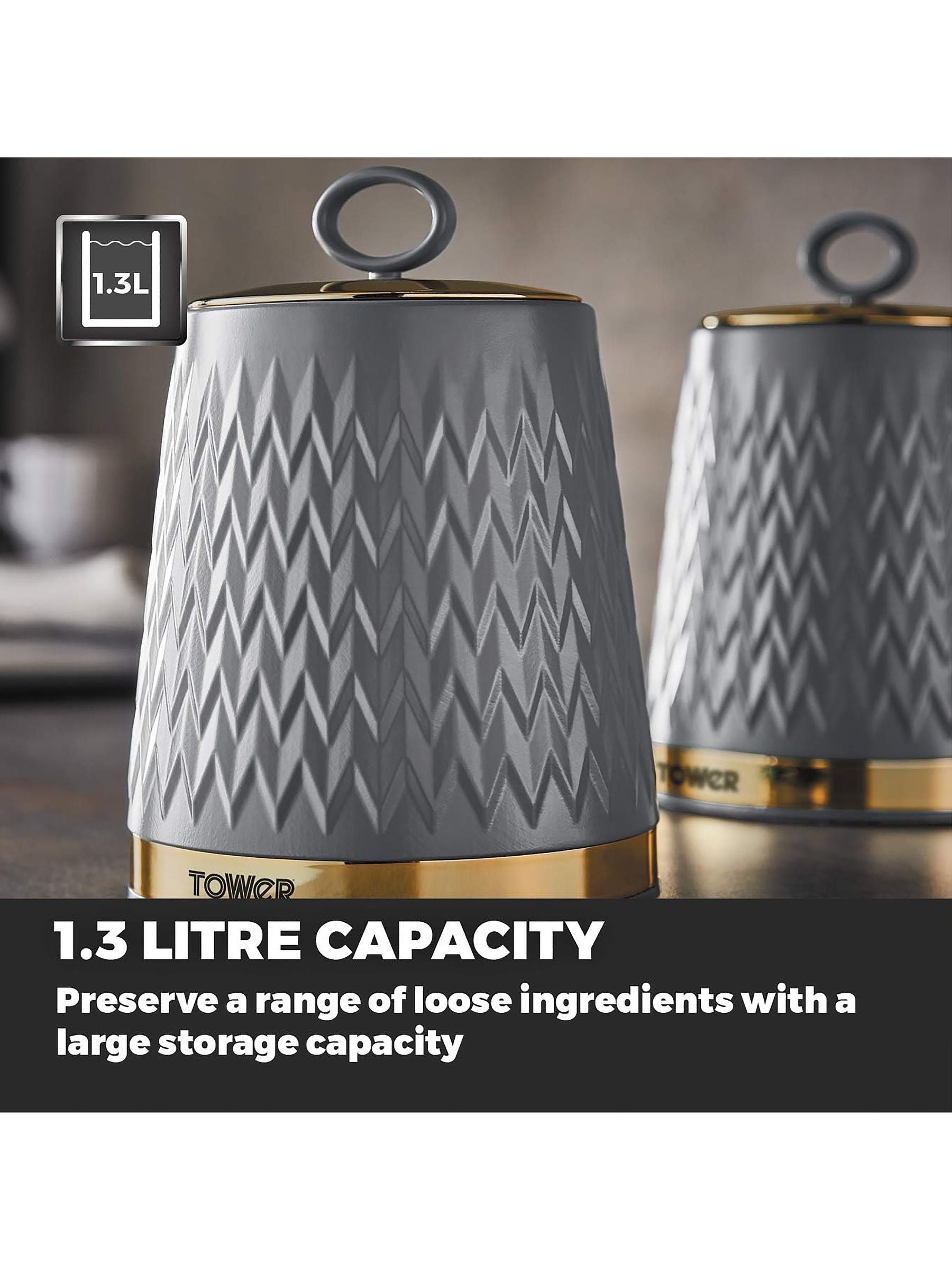 This set of three Empire canisters is the perfect way to store your tea, coffee and sugar on your kitchen countertop. Each canister features a stylish grey body complemented by a mirrored finish lid with a unique V-shaped pattern and topped off with polished elegant bronze accents around the base, providing an eye-catching addition to your kitchen décor. The capacity for each canister is 1.3 litres, which will ensure your contents will last a significant amount of time. The lids have been designed to include a large hoop that makes the canisters easier to open. They are also easy to maintain, requiring just a simple wipe to clean in order to maintain the quality finish. Dimensions for each canister are H 14.50 x W 13.50 x D 11.00cm. This set forms part of the Empire range of kitchen products, which includes a towel pole, mug tree and bread bin.