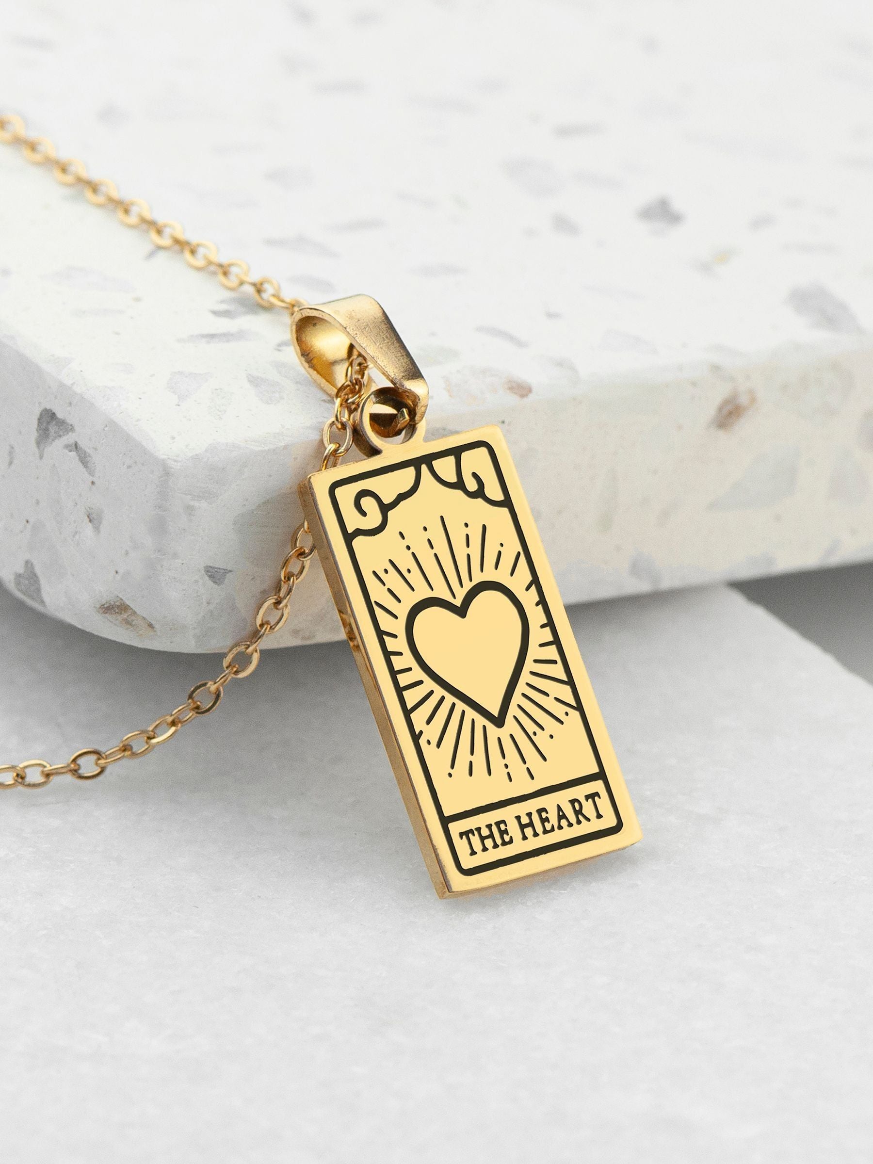 Whether you're dressing up for a special occasion or just accenting your everyday look, our beautiful personalised heart tarot card necklace is a perfect choice. This stunning gold plated necklace features a heart tarot card design, making it a luxurious and eye-catching piece. ‘Heart’ comes as standard text and represents love and compassion, particularly of those people closest to you. It also comes presented in a sleek black gift box, making it perfect for gifting. To make this gift even more special and meaningful, personalise it with a heartfelt message for your loved one and our amazing engraving team will do the rest! It’ll make the perfect gift for a birthday, Christmas, or Valentine's Day, and is sure to make anybody feel loved and special. Message: Up to 40 characters Chain Length: 40.5cm-47cm Pendant Dimensions: 2.5cm x 1cm x 0.2cm