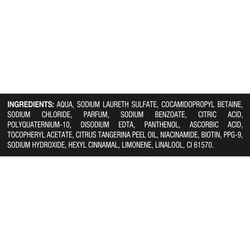 Aqua, Sodium Laureth Sulfate, Cocamidopropyl Betaine, Sodium Chloride, Parfum, Sodium Benzoate, Citric Acid, Polyquaternium-10, Disodium EDTA, Panthenol, Ascorbic Acid, Tocopheryl Acetate, Citrus Tangerina Peel Oil, Niacinamide, Biotin, PPG-9, Sodium Hydroxide, Hexyl Cinnamal, Limonene, Linalool, CI 61570