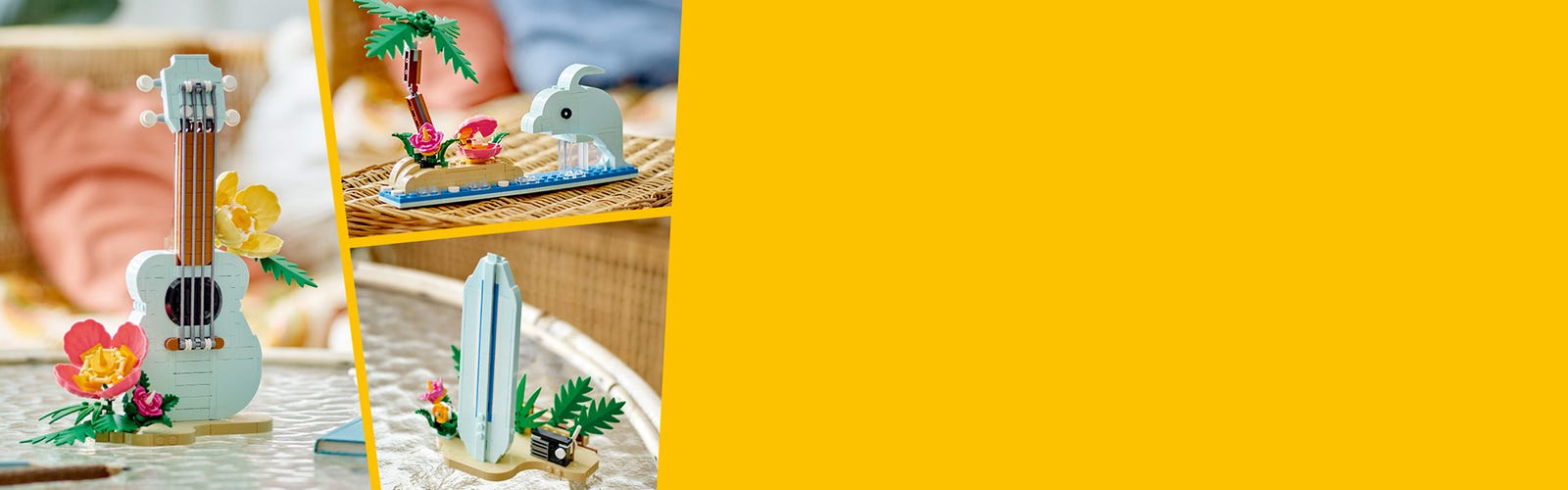 Kids can build, play with and display 3 beach-themed models in the LEGO® Creator Tropical Ukulele (31156) 3in1 playset. A great gift idea for girls and boys aged 8+, it features a ukulele on a beach scene stand with 2 colourful flowers and grass. The instrument toy can be detached from the stand and has 4 plastic strings that vibrate when strummed.