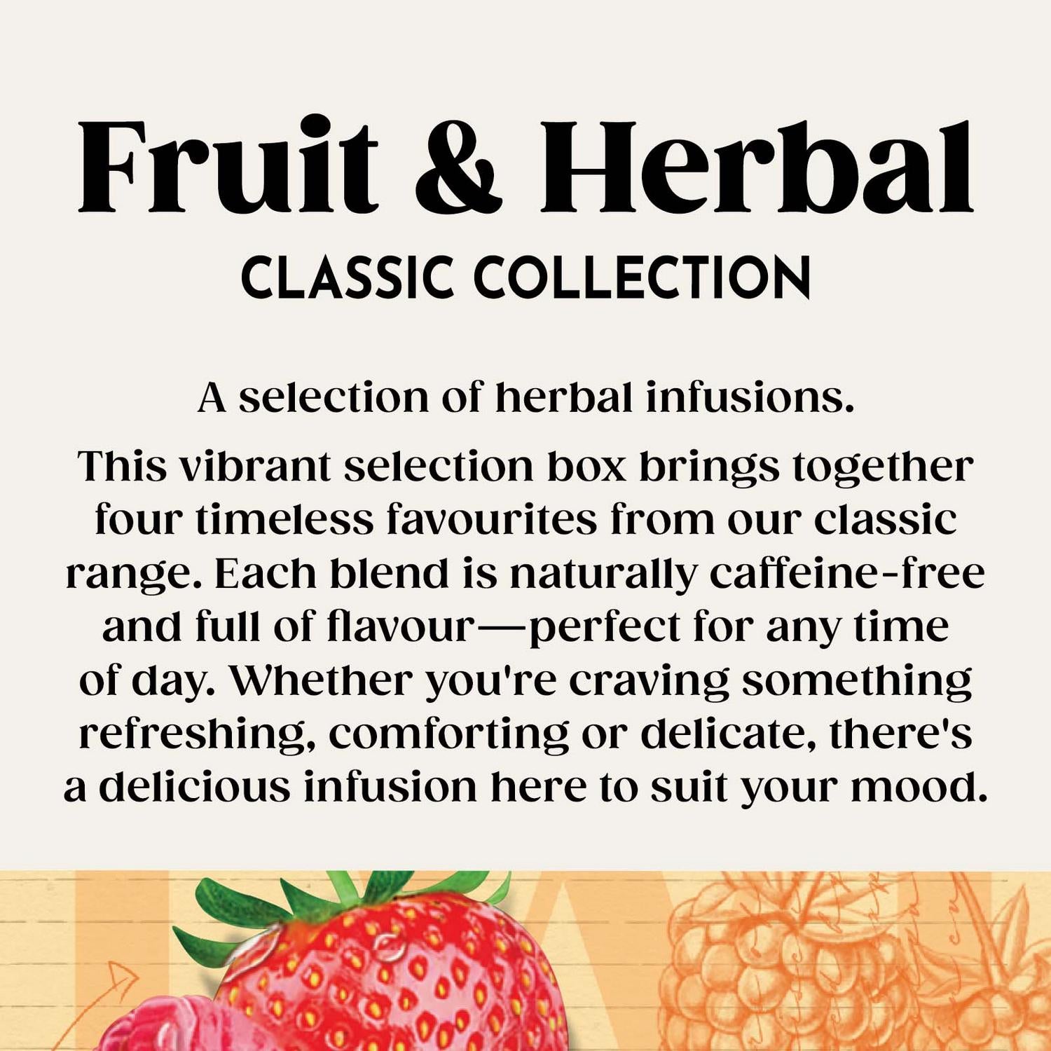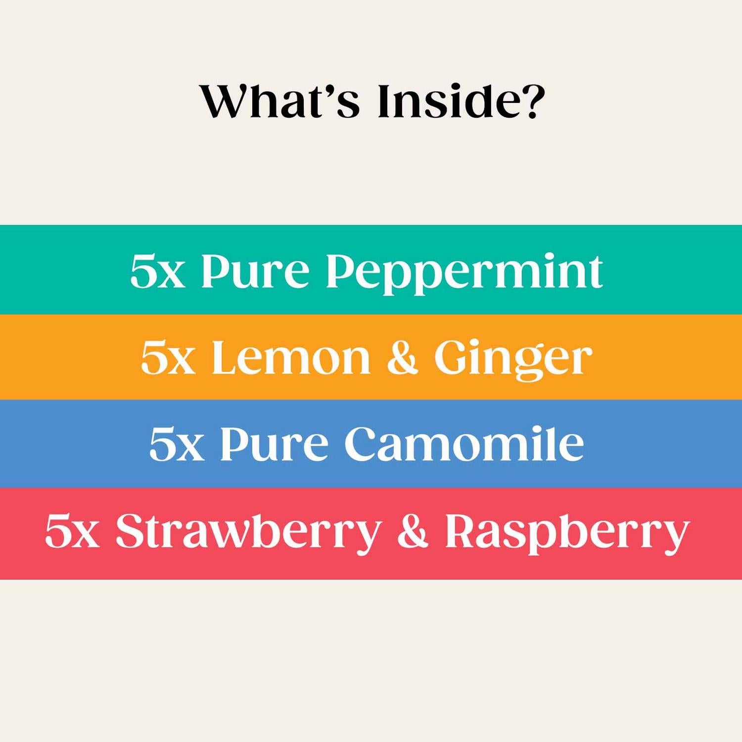 • Includes four distinct varieties: Peppermint, Lemon & Ginger, Camomile, and Strawberry & Raspberry.