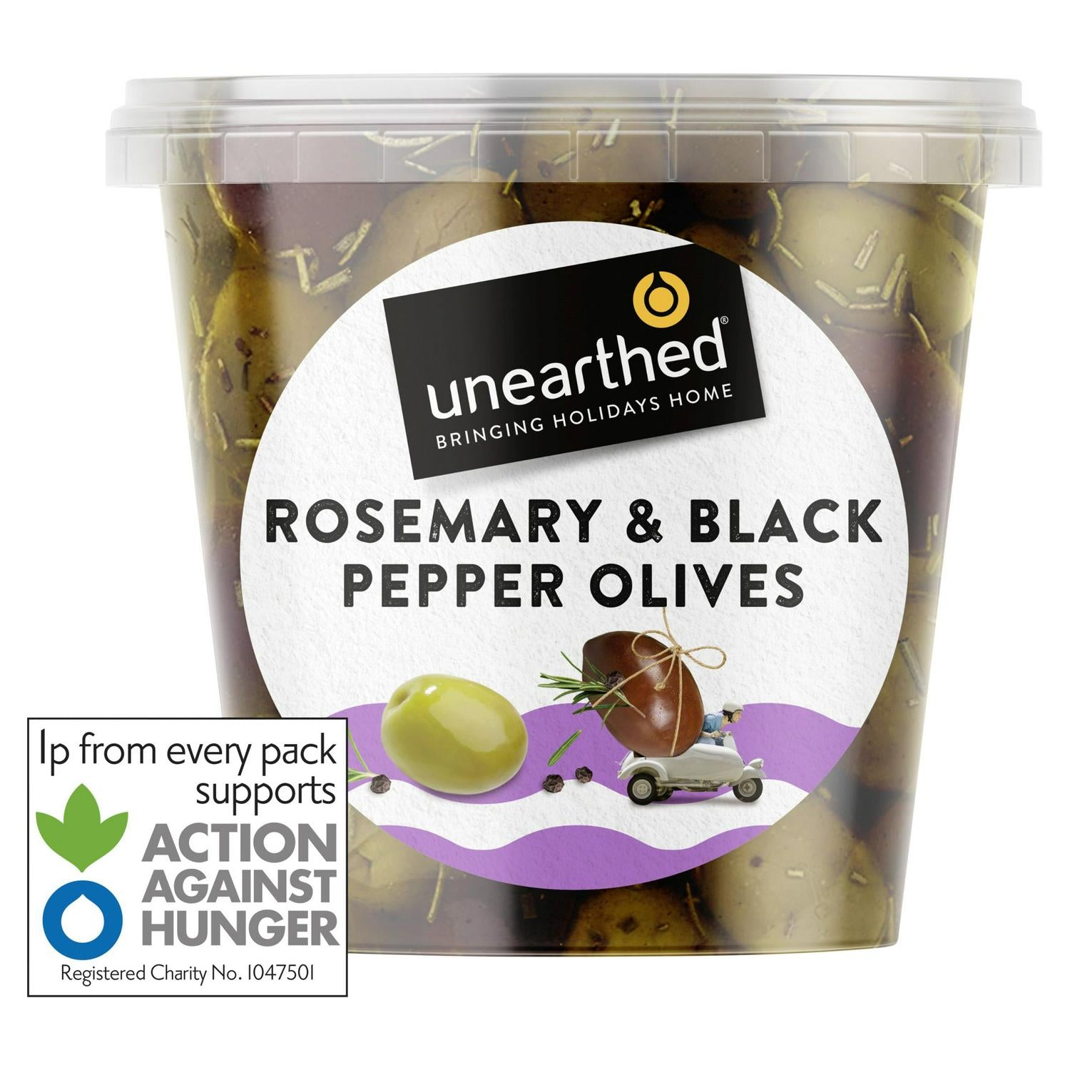 Unearthed Rosemary & Black Pepper Olives feature a mix of pitted green and black varieties. These Mediterranean-style olives are seasoned to provide a distinct flavour profile with a notable peppery kick from the black pepper and aromatic rosemary.