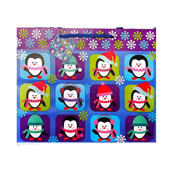 Design: Christmas Hat, Penguin, Printed, Snowflake. Carry Handles, Gift Tag. Compartments: 1 Main Compartment.