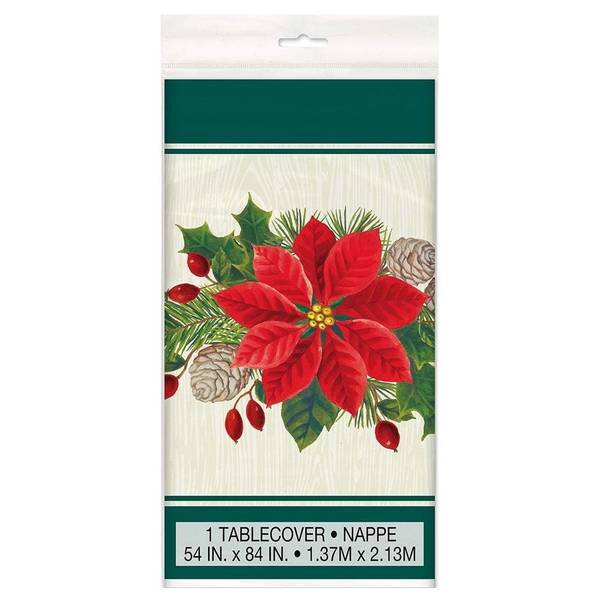 Dress your table setting with this Unique Party Poinsettia Party Table Cover, perfect for holiday gatherings or seasonal celebrations. This rectangular cover is manufactured from plastic, offering a quick and convenient way to decorate and protect surfaces. It is designed for straightforward setup, making event preparation simpler.