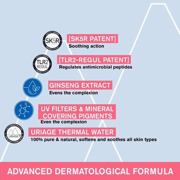 a rich and nongreasy cream that provides the optimal combination of skincare and makeup coverage for rapid application and a perfectly sheer finish it conceals redness evens out skin tone and adds radiance to the complexion while offering protection against uv light thanks to its spf30 upon application comfort is immediately restored to the skin leaving it soft perfectly moisturized and soothed in a single step this treatment evens out skin tone and illuminates the complexion the mineral pigments instantly correct redness as well as a dull and uneven complexion conceals redness strengthens and protects skin the tlr2regul complex works synergistically with ginseng and red algae extracts to regulate immune pathways and strengthen blood vessel walls provides lasting moisturereplenishment rich in uriage thermal water with moisturizing and soothing properties this cream hydrates and provides immediate and longlasting skin comfort protects skin from uvauvb light the high tolerance sun filter blocks uvauvb rays