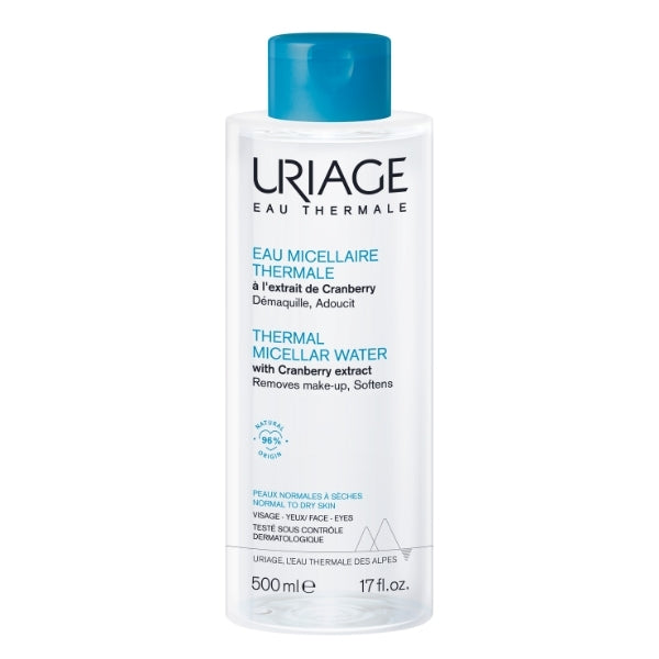 Uriage Thermal Micellar Waters are perfectly suited for removing make-up from all skin types, thanks to the unique properties of Uriage Thermal Water. The micelles' gentle, non-ionic constituent surfactants act like magnets to effectively capture make-up and impurities. Cleanse and Remove Make-up This micellar water with gentle non-ionic surfactants gently eliminates make-up and impurities. Moisturises Enriched with Cranberry extract, this product moisturises the skin, leaving it smooth and supple. Protects Against Dryness Enriched with moisturising Uriage Thermal Water.