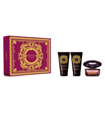 This Versace Crystal Noir gift set offers an exquisite introduction to the iconic fragrance. It features three complementary scented products, perfect for layering your scent ritual. The presentation reflects the luxury associated with the Versace brand aesthetic.