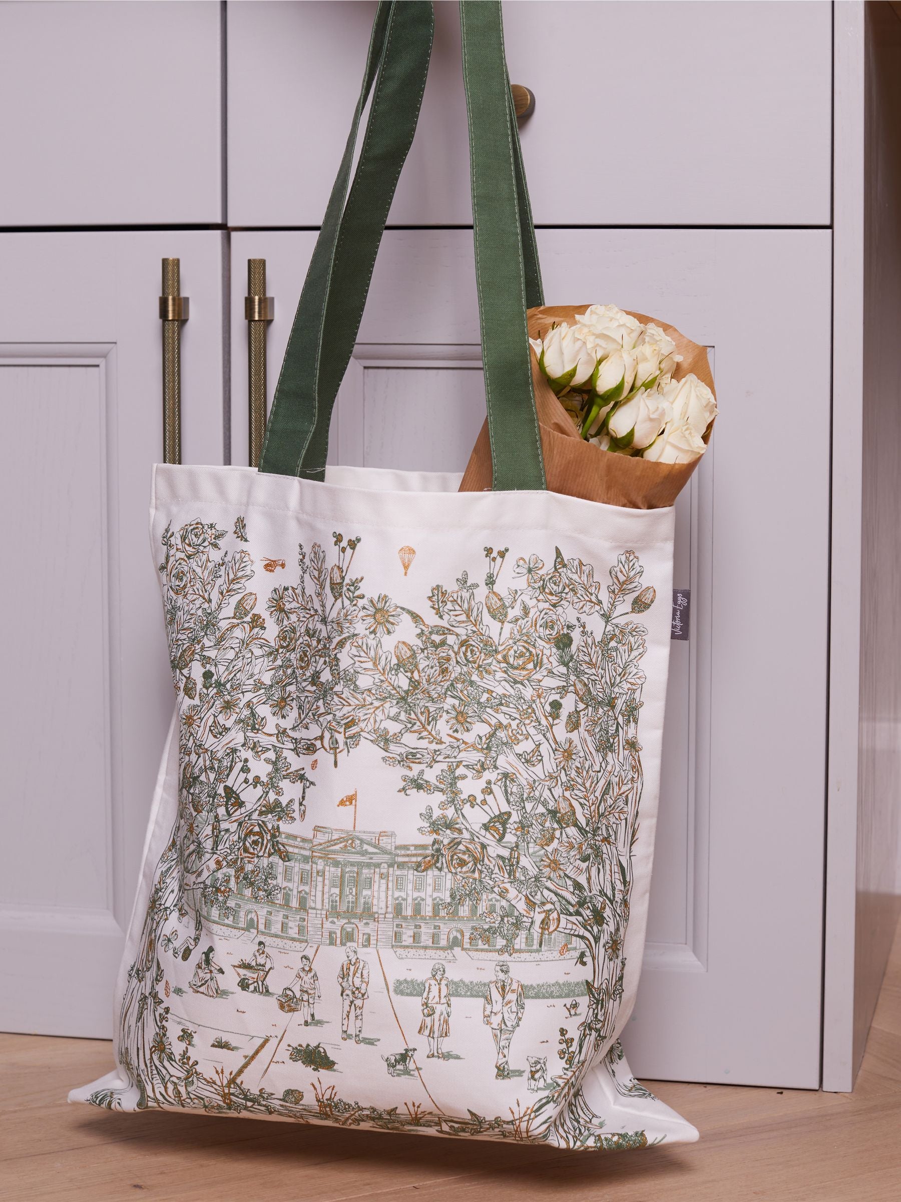The intricately hand-drawn Royal Family design gazes upon the grounds of Buckingham Palace, as the family go about their daily lives. The fairytale tree represents the unique characteristics of each member. Mug: Hand crafted in Stoke-on-Trent, Staffordshire, UK. Made exclusively for Victoria Eggs by Duchess China 1888. Decorated using 22ct gold.- Fine bone china, made from Cornish clay. Dimensions: 8.5(d) x 9(h)cm Canvas Bag: Dimensions: approx 38 x 43 cm. Handmade in Britain, printed on both sides, onto 10oz canvas.