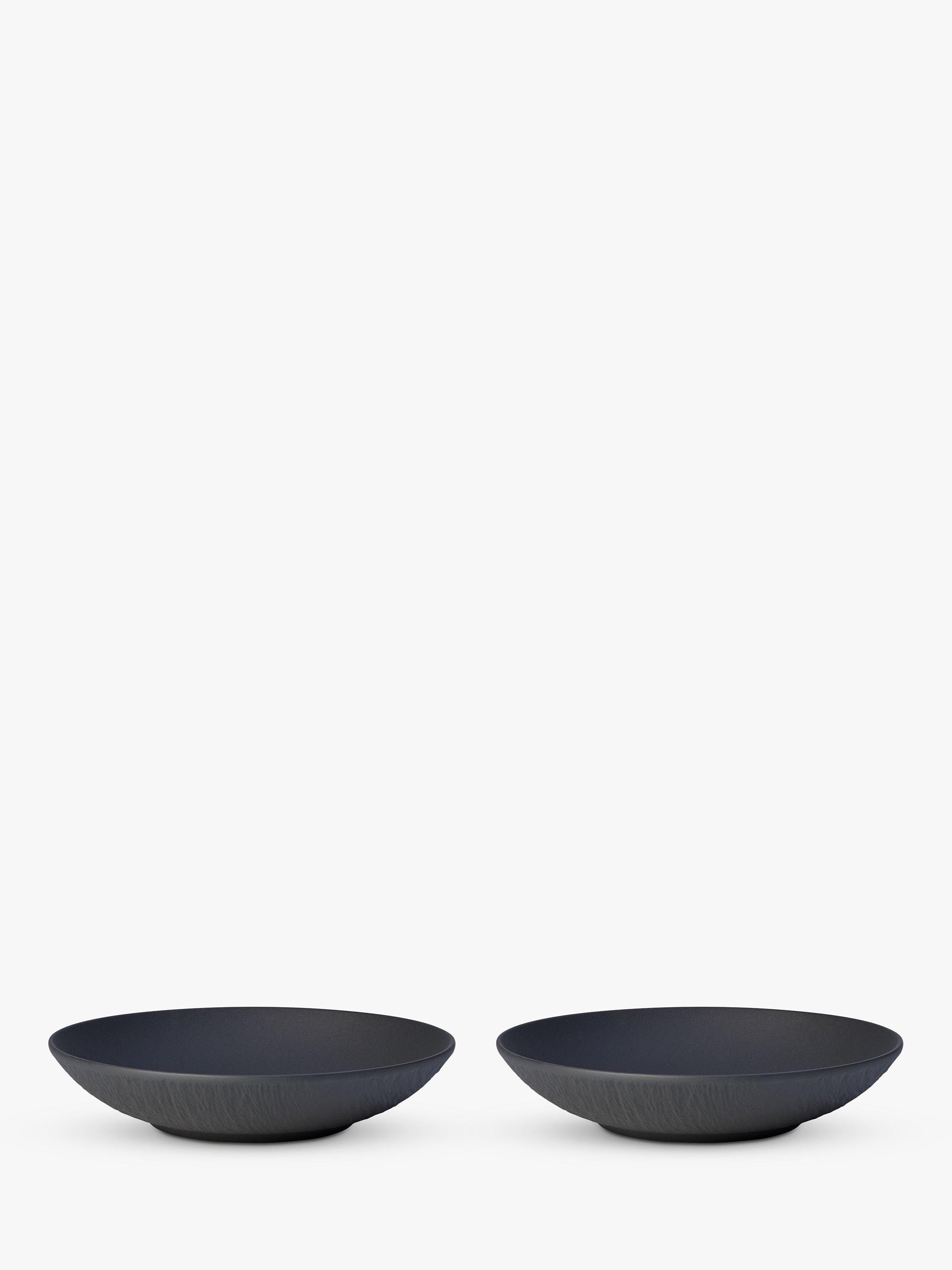 Villeroy Boch presents the Manufacture Rock Porcelain Flat Bowl Set, which contains two large 23.5cm bowls ideal for salads or side dishes. This particular piece showcases a striking textured matte surface, mimicking natural slate's rugged beauty for daily meals. It is a durable, versatile choice for modern kitchens here too.