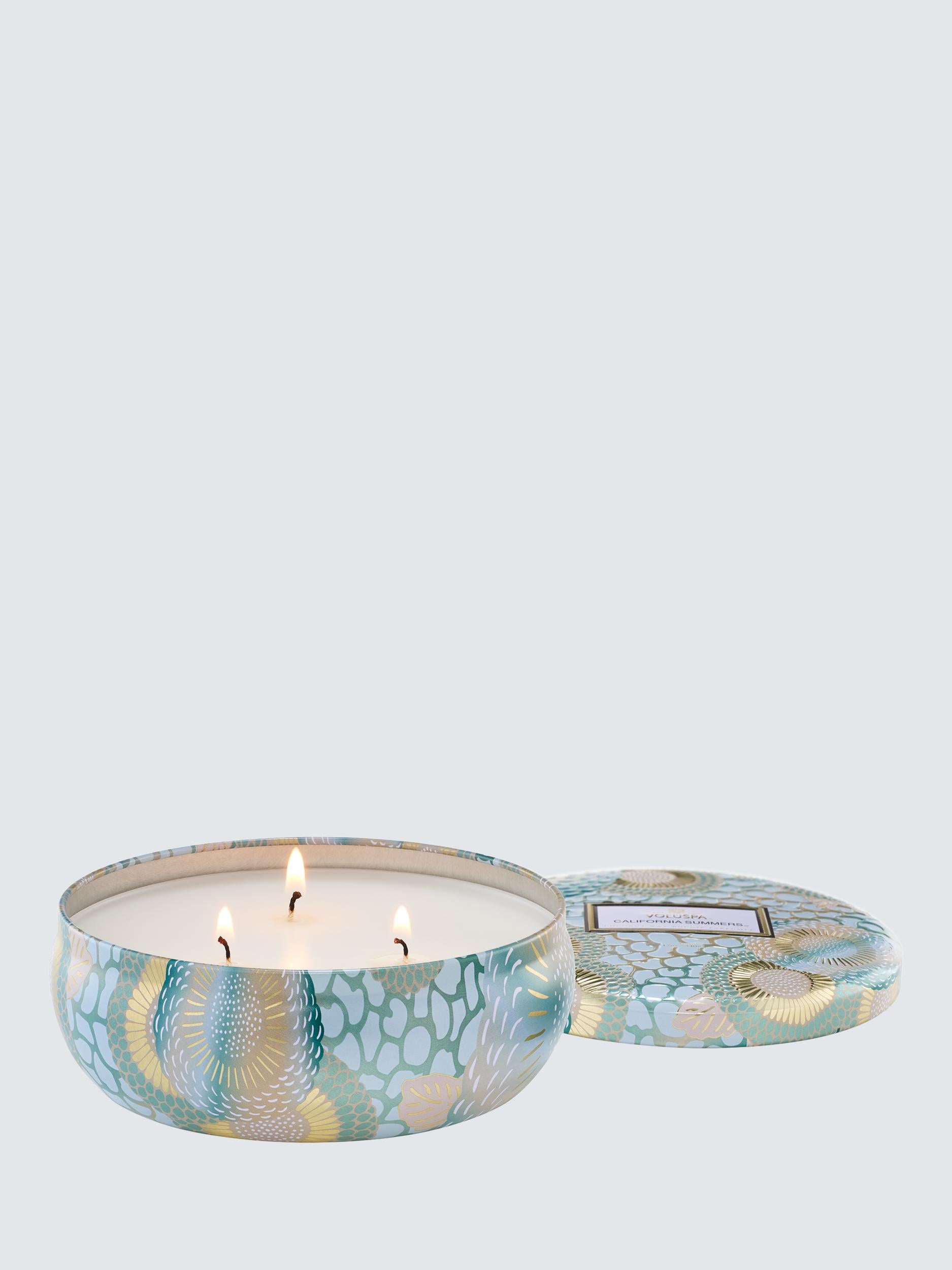 Voluspa California Summers Three Wick Tin Candle (500G) provides luxurious home fragrance. Crafted using a unique coconut wax blend, this candle delivers excellent scent throw for rooms large and small. Its three wicks ensure an even burn, lasting approximately forty hours. This premium item is proudly made in the USA.