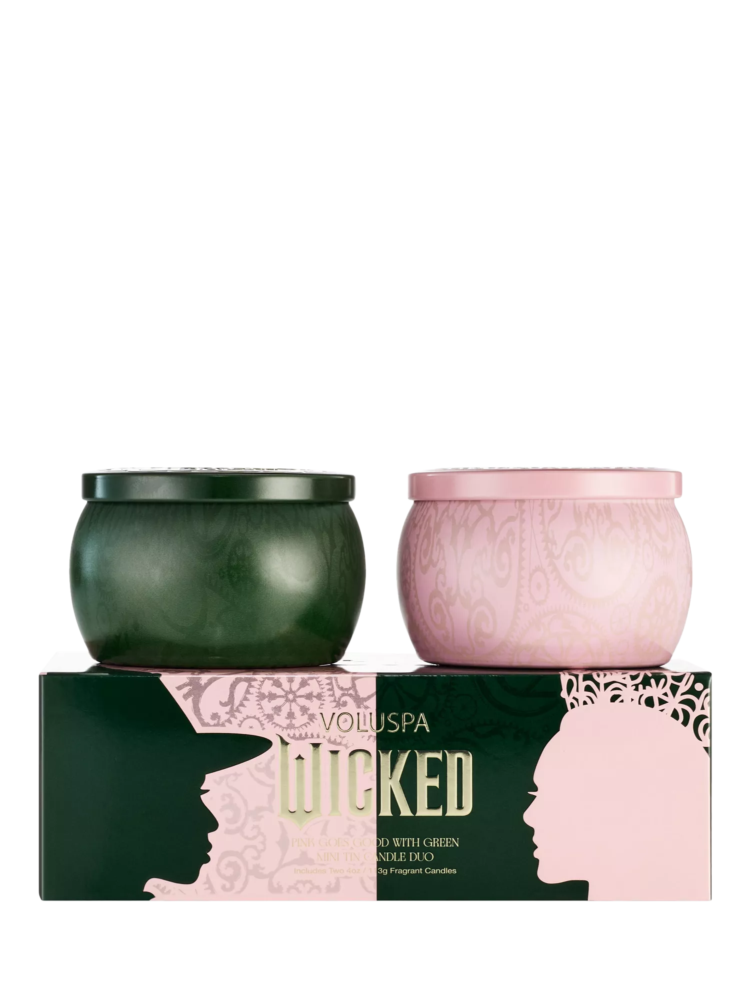 Uncover the aromatic tale of two opposites that attract. This set includes 2 decorative tin candles with intricate Emerald City details. Each lid features a silhouette of Glinda and Elphaba's profile inside of an embossed gold-patterned frame. Packaged in an extravagantly decorated pink and green box. This set includes Glinda's Perfectly Pink Yuzu and Elphaba's Bewitching Banyan Forest Mini Tin Candles. Each candle is 4oz /113g.