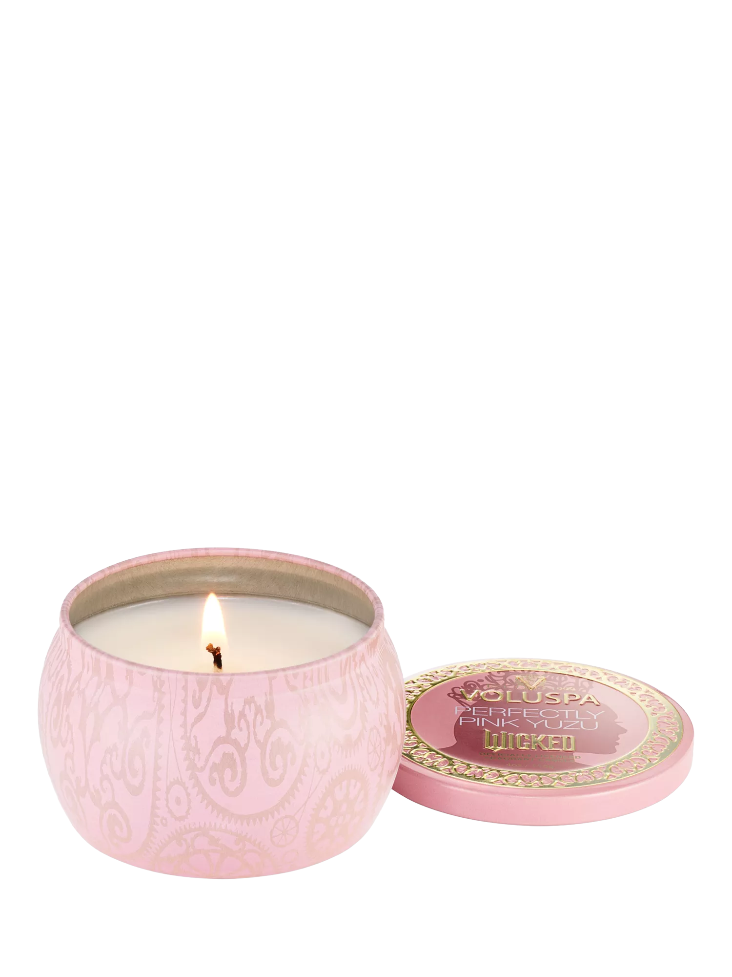 This perfectly pink decorative tin comes packaged in an iconic Voluspa Mini Tin shaped pink vessel. The tin candle lid features a silhouette of Glinda's profile inside of an embossed gold-patterned frame.