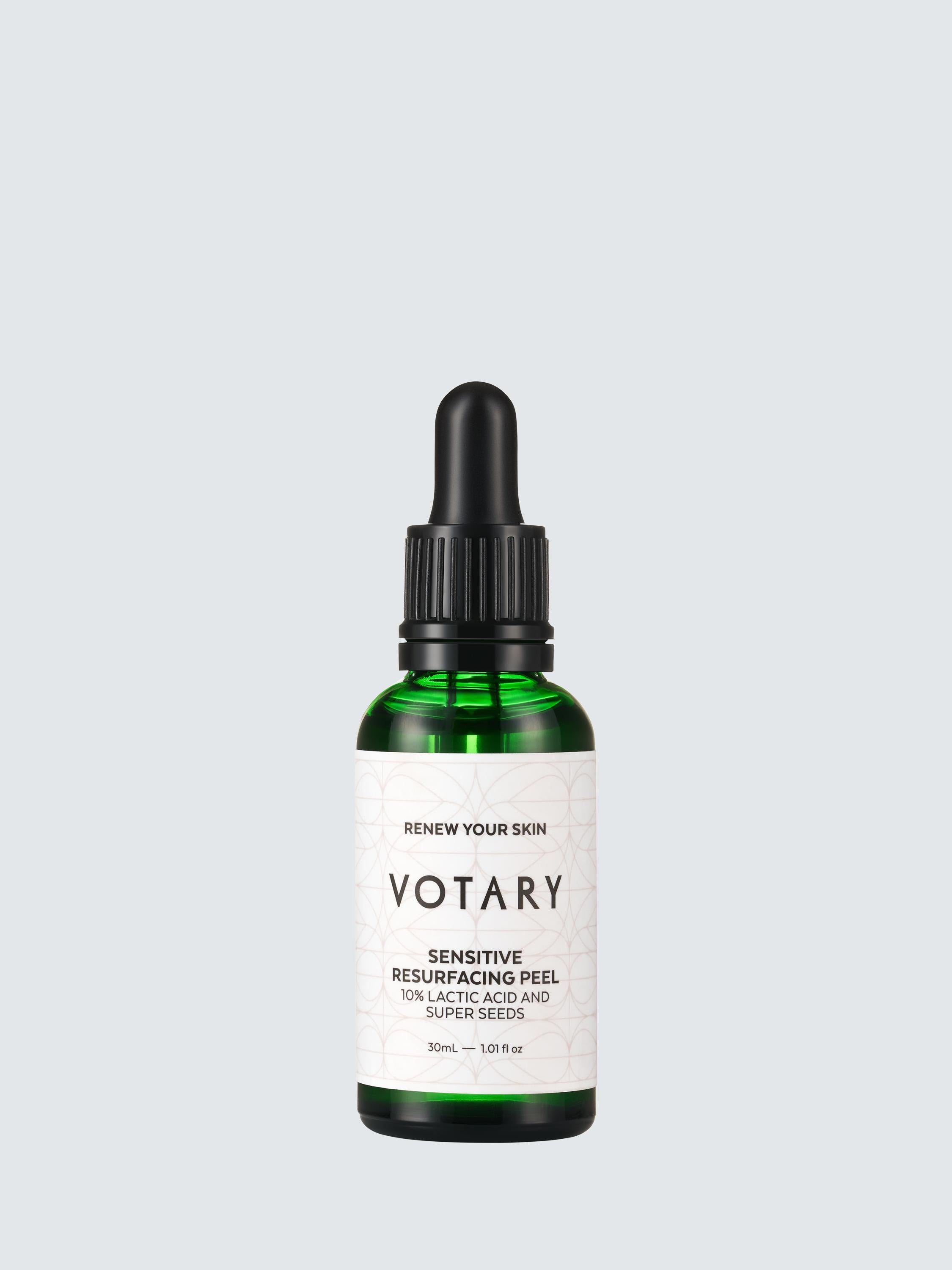Votary Sensitive Resurfacing Peel 30ml is an instant skin transformer designed for delicate complexions. This formulation expertly blends 10% lactic acid with calming super seed extracts for effective renewal. It is dermatologically tested.