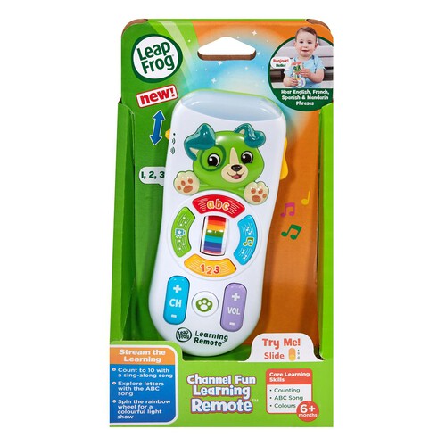 Read MoreWith the LeapFrog Channel Fun Learning Remote™, little ones can press up, down, left or right to hear an abc song, listen and move to different dance styles, find out about fun programs & learn cool language phrases. Press the volume button to hear softer and louder volume phrases. They can press the channel button to scroll through 10 different channels with fun facts about each. The rainbow colour roller prompts learning with a different phrase and song for each colour. Lovable Scout is always at their fingertips to entertain, encourage and help children explore. Suitable for 6+ months. Requires 2x AAA batteries (included).
