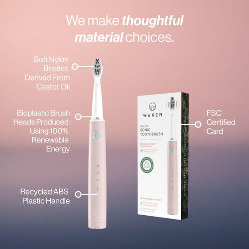 The Waken Sonic Toothbrush handle is made from post-consumer recycled plastic and Waken replaceable brush heads are made from bio-plastic produced using 100% certified renewable energy.
