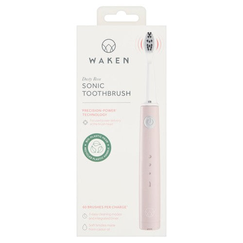 This Waken Rechargeable Sonic Toothbrush delivers focused cleaning power in the Dusty Rose finish. Its design incorporates patent-protected 'Precision-Power' technology, positioning the motor near the brush head for effective results. Enjoy up to 60 brushes per single charge, based on standard usage.