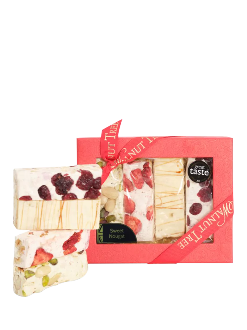 Four individually wrapped bars of nut rich, sweet soft caramel or infused strawberry - Great Taste Gold Star - award winning nougat. Hand packed in the UK in a bespoke bowed box.
