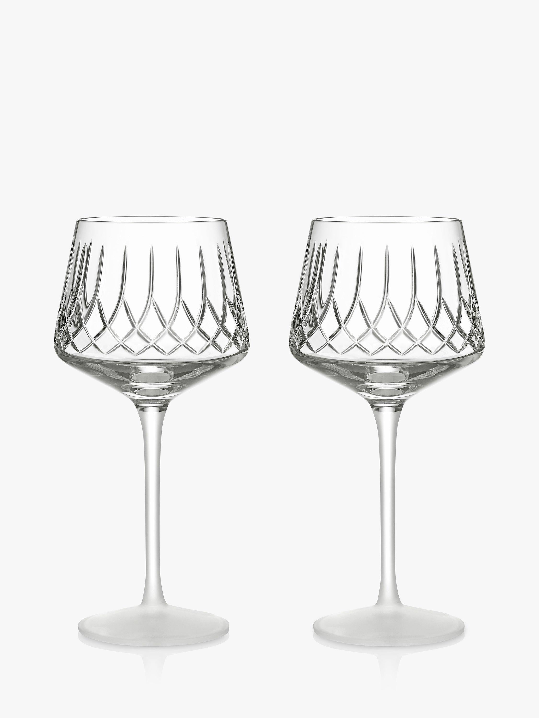 A pair of universal wine glasses from the Lismore Arcus collection, introduced by Waterford Crystal in celebration of the 70th anniversary of the renowned Lismore pattern. A modern interpretation of the crystal diamond and arch cuts, the cut crystal glass enhances the colour, clarity and enjoyment of both fine red and white wines.