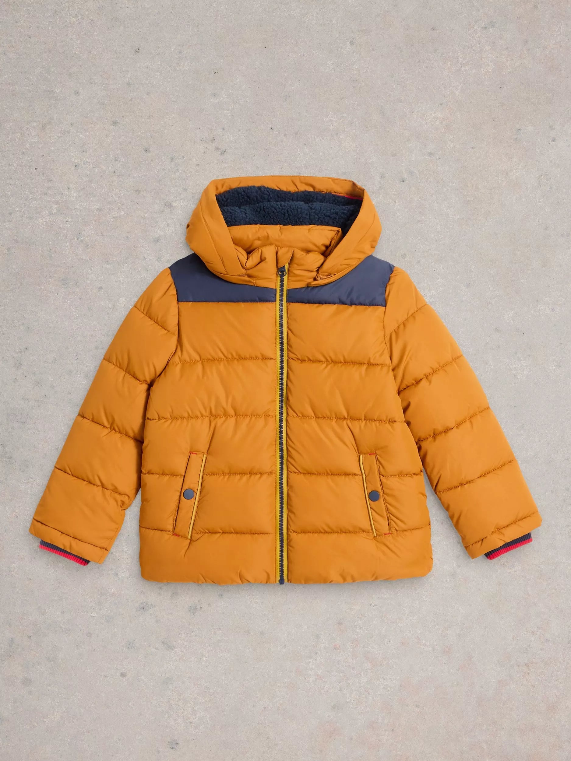 Keeping them warm on cooler days, this short puffer coat from White Stuff is topped with a cosy borg lined hood and features snap pockets, elasticated cuffs and a zip front.