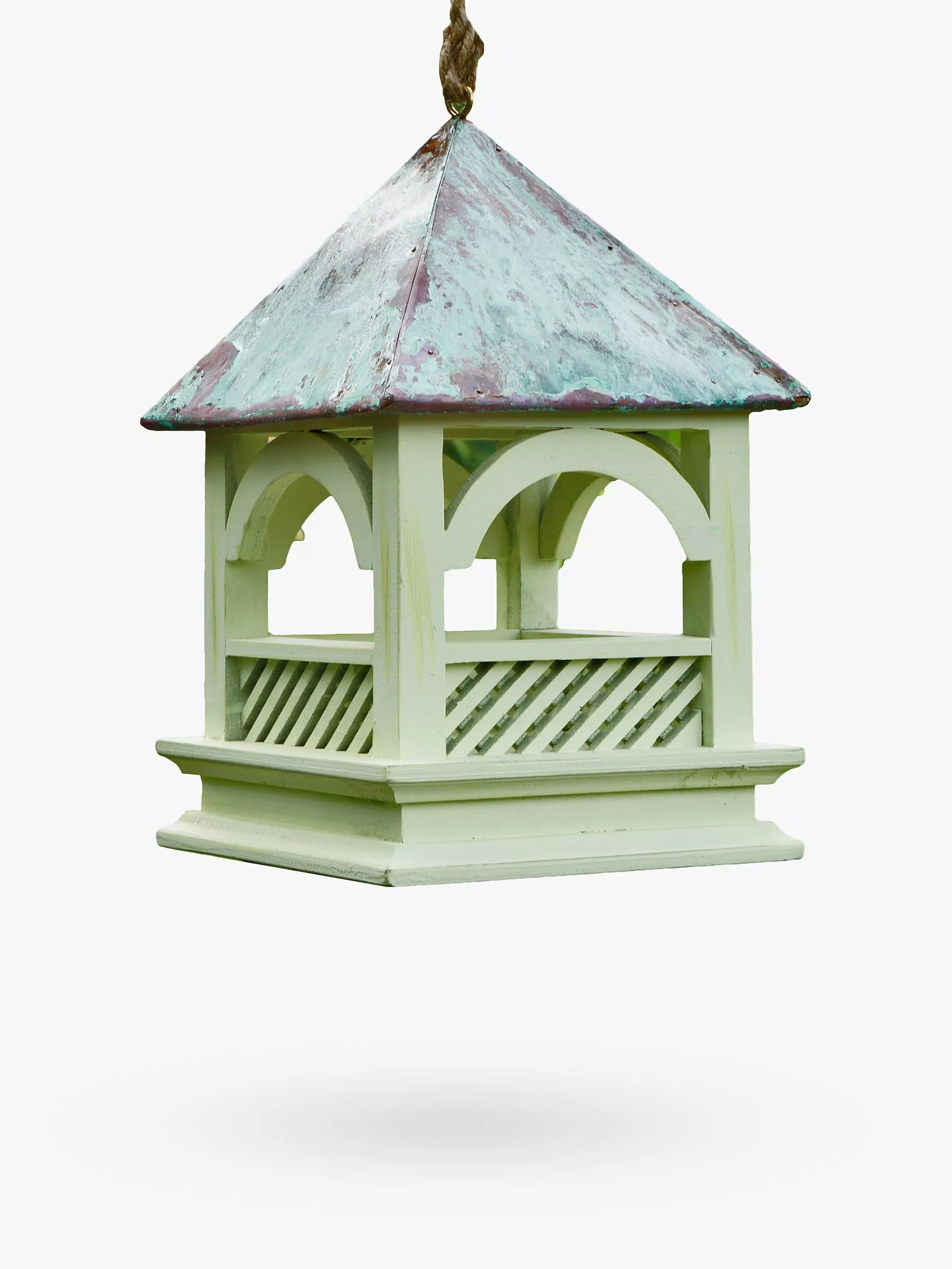 Attractive and practical, the Hanging Bempton Bird Table from Wildlife World is handmade from FSC-certified timber from sustainably managed forests. It features decorative woodwork in a painted green finish, with a real verdigris copper roof and a natural rope for hanging up.