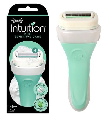 Intuition Sensitive comes with 4 precision blades surrounded by a skin moisturising solid infused with Aloe, Vitmain E and Pro Vitamin B5 to ensure your skin is truly cared for. It also lathers and shaves in one step without the need for shave gel or prep. All you need in one simple tool!