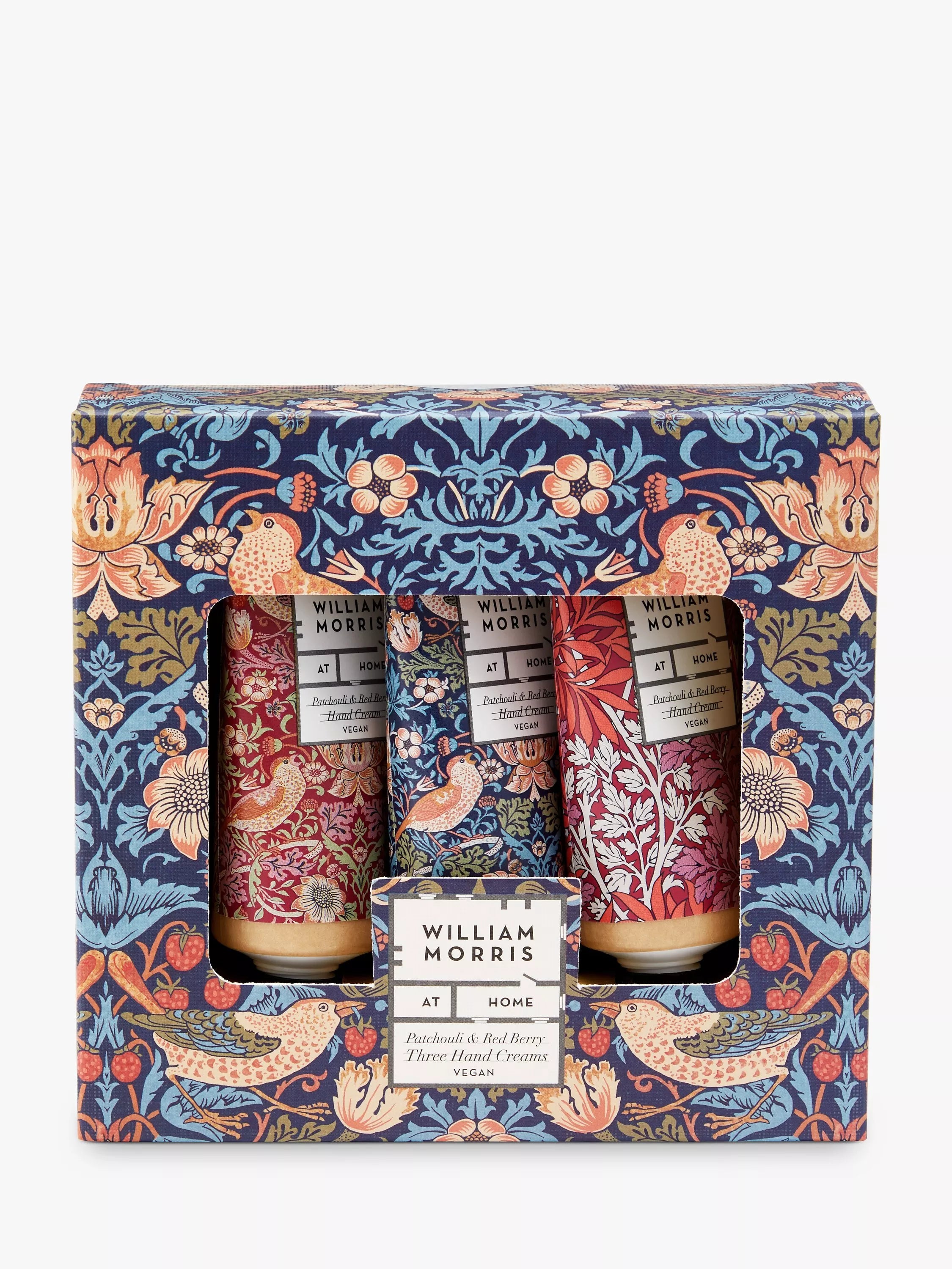 Perfectly sized for on the go. Three Patchouli & Red Berry pocket hand creams packed with skin-loving extracts and oils. A great gift decorated with iconic Strawberry Thief and Foliage designs by William Morris recoloured in a vibrant palette.