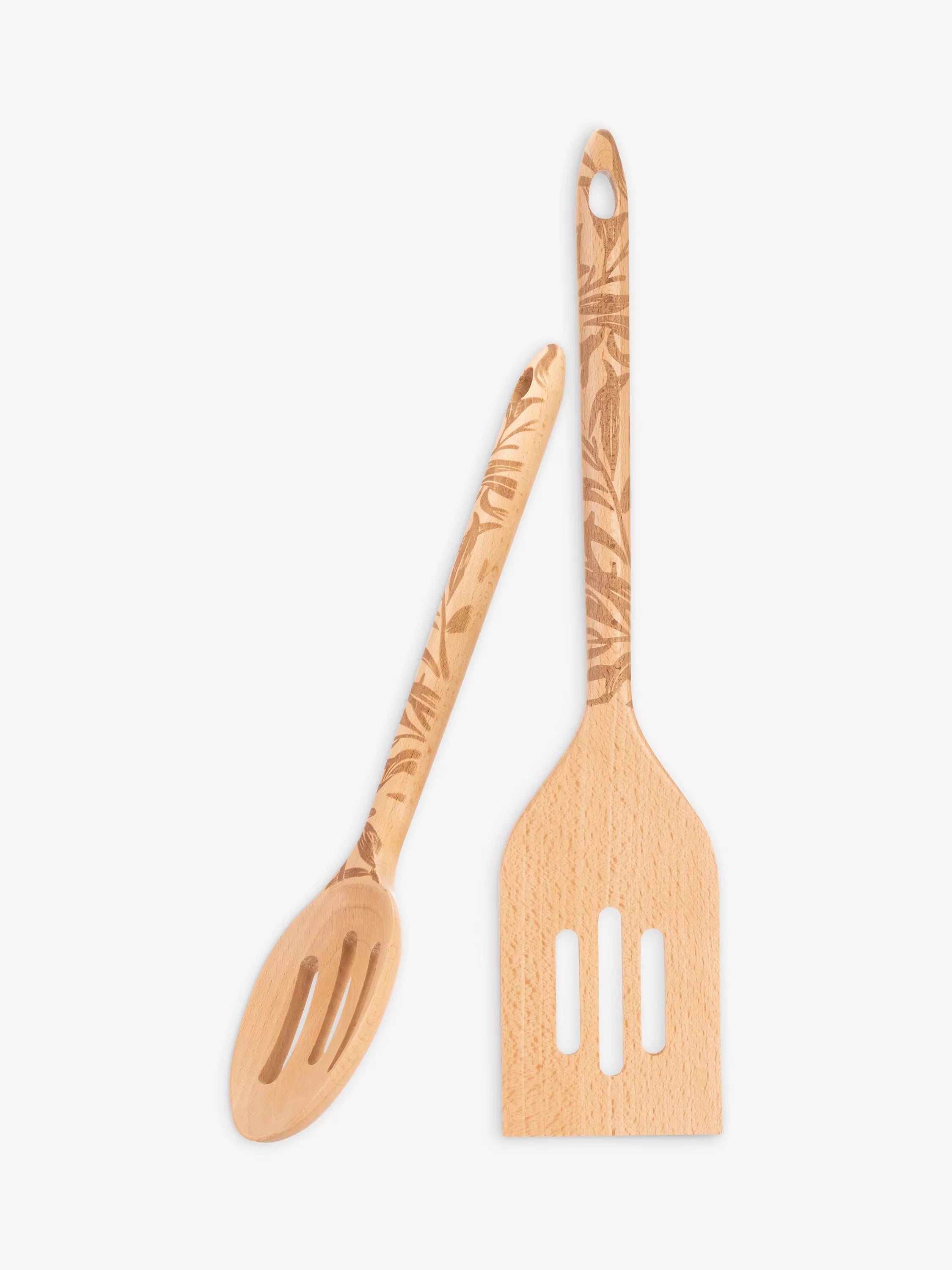 Beautiful pair of kitchen utensils made of beech wood. Etched with a print inspired by the work of Arts and Crafts designer and artist William Morris. Includes a slotted spoon and slotted turner.