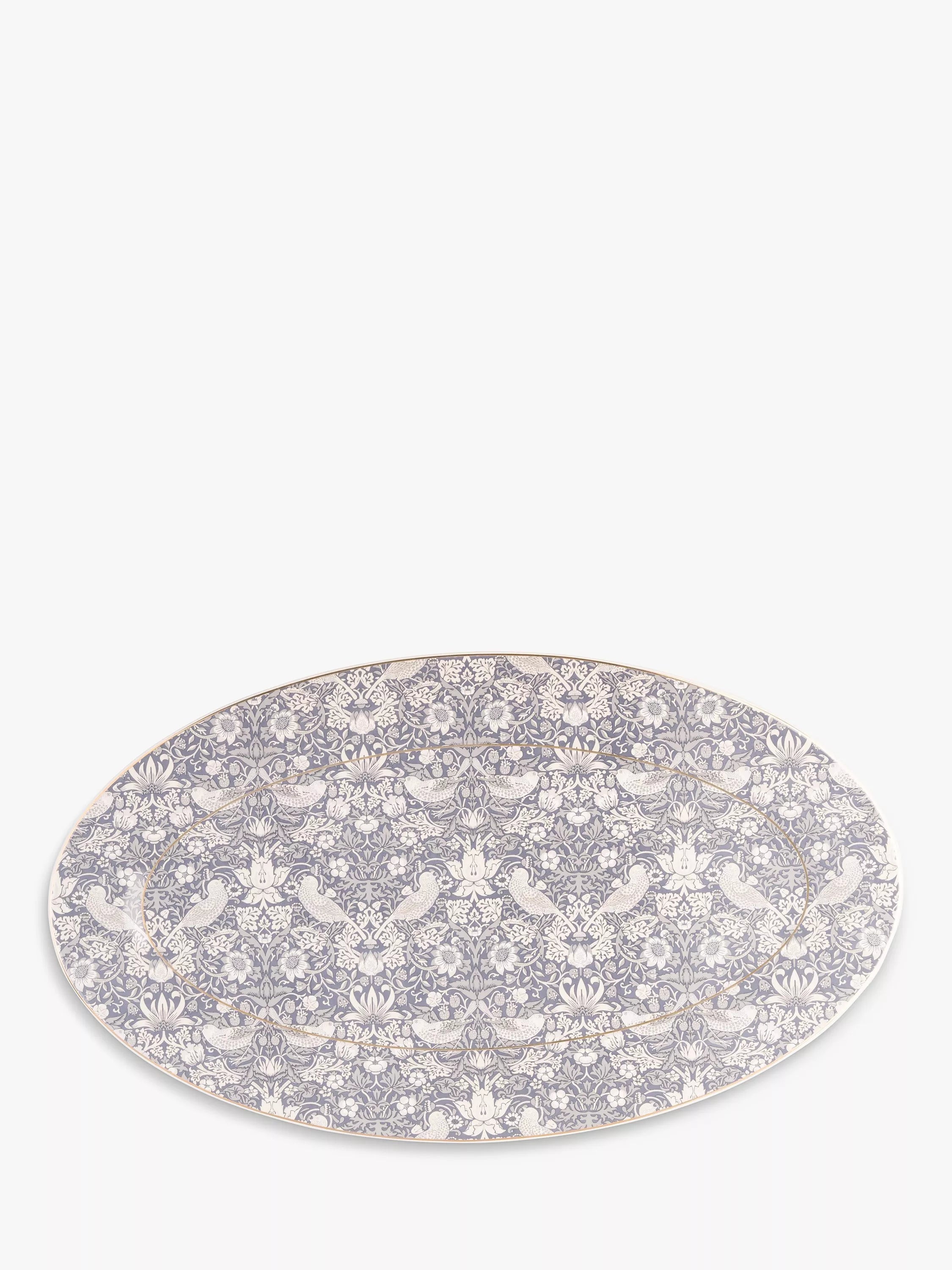 Oval serving platter in the Strawberry Thief print from Arts and Crafts designer and artist William Morris. Made from durable stoneware, this elegant platter is great for everyday use or for special occasions. Dishwasher-safe for easy cleaning.