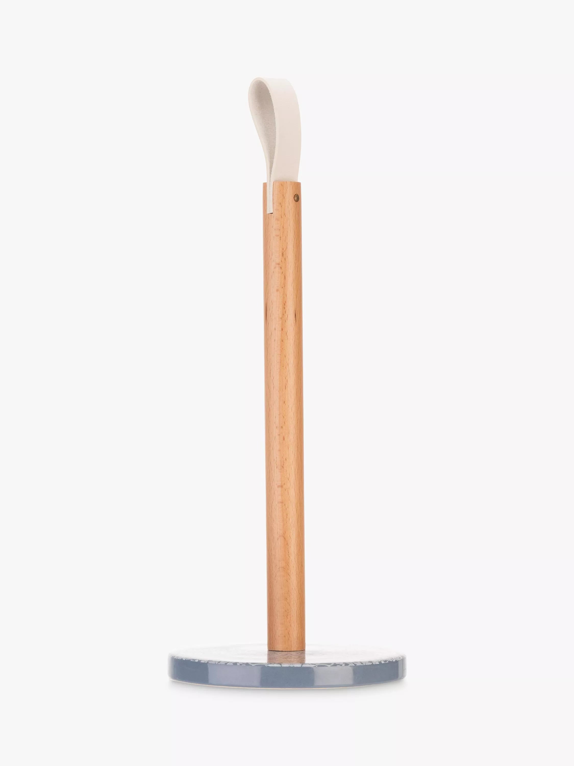 Kitchen roll holder featuring the famous Strawberry Thief print on its ceramic base. Comes with a beech wood spindle and faux-leather carrying strap.