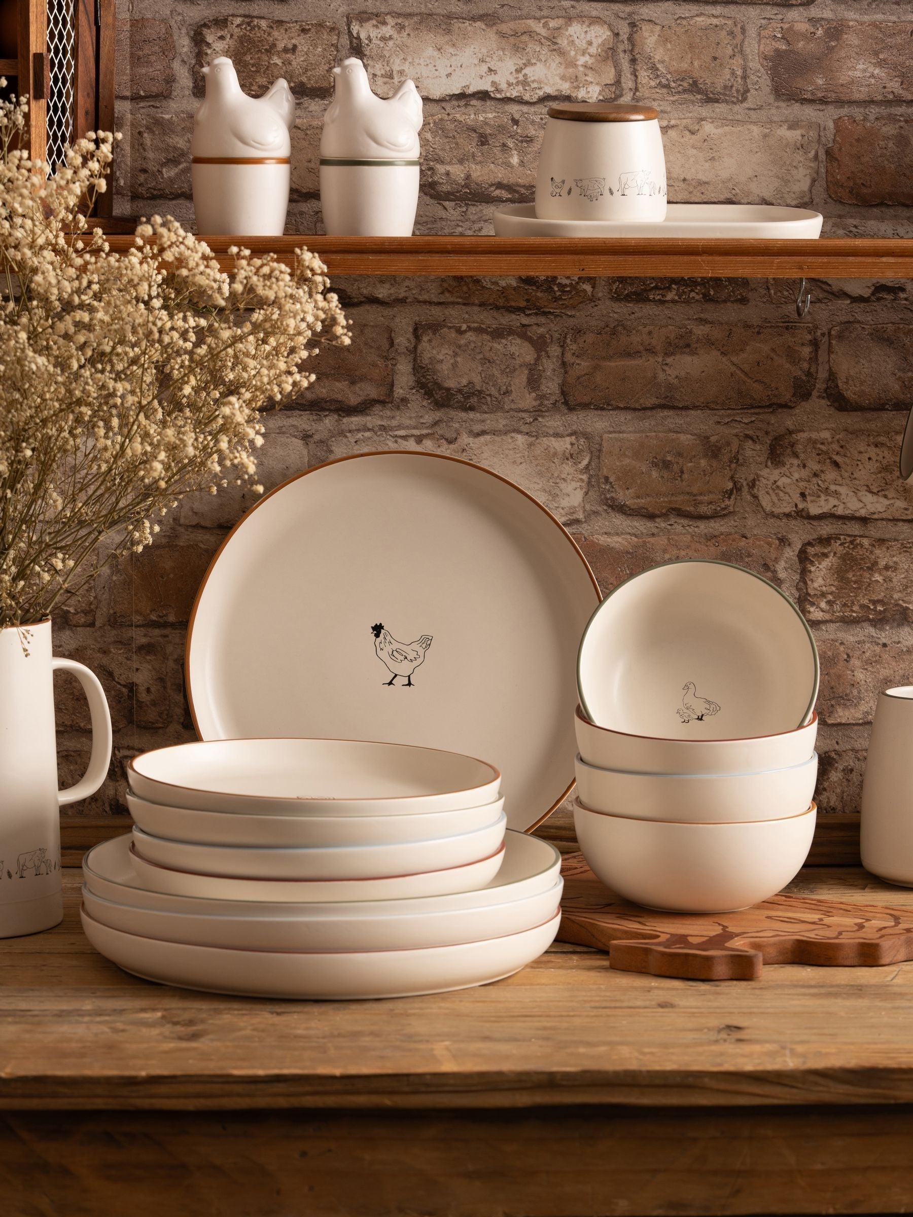 Welcome the Woodbury Lane 12 Piece Animal Dinner Set into your home, a charming blend of tradition and modern flair. Crafted from durable stoneware with a hand-painted rim, this set features illustrative animal decals. Dishwasher safe for everyday use, it's perfect for creating a warm, inviting farmhouse-inspired atmosphere.