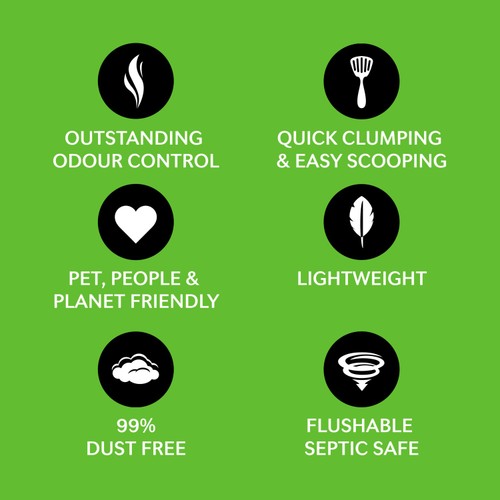 Made with corn, Natural Sustainable, Naturally Safe for You & Your Cat, No Harmful Chemicals, No Artificial Perfumes, No Clay Dust