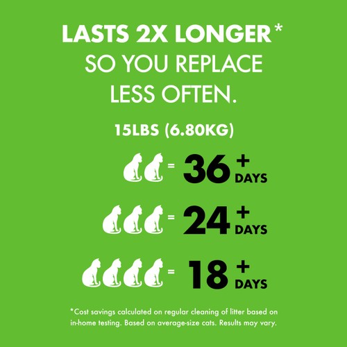 * Use Less Get More. Lasts 36+ days when used with two cats (**cost saving calculated based on average size cats, using 6.8kg bags. Results may vary).