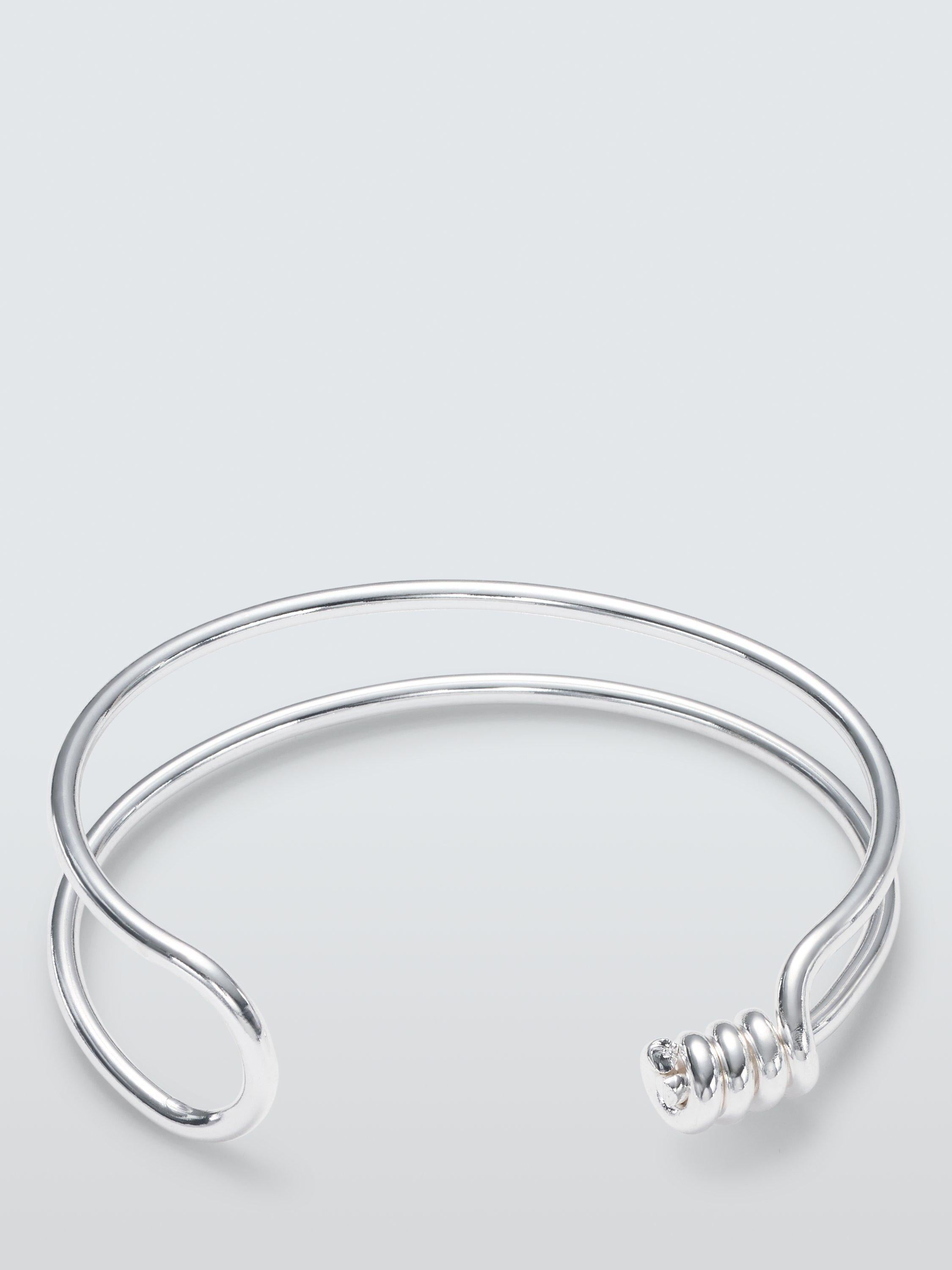 This John Lewis Silver Cuff Bangle offers a modern, structural design perfect for contemporary jewellery collections. It features two distinct ends: one shaped as a simple u-curve and the other presenting an intricate wrapped spiral detail. This piece provides everyday elegance and sophisticated detailing for any wearer.