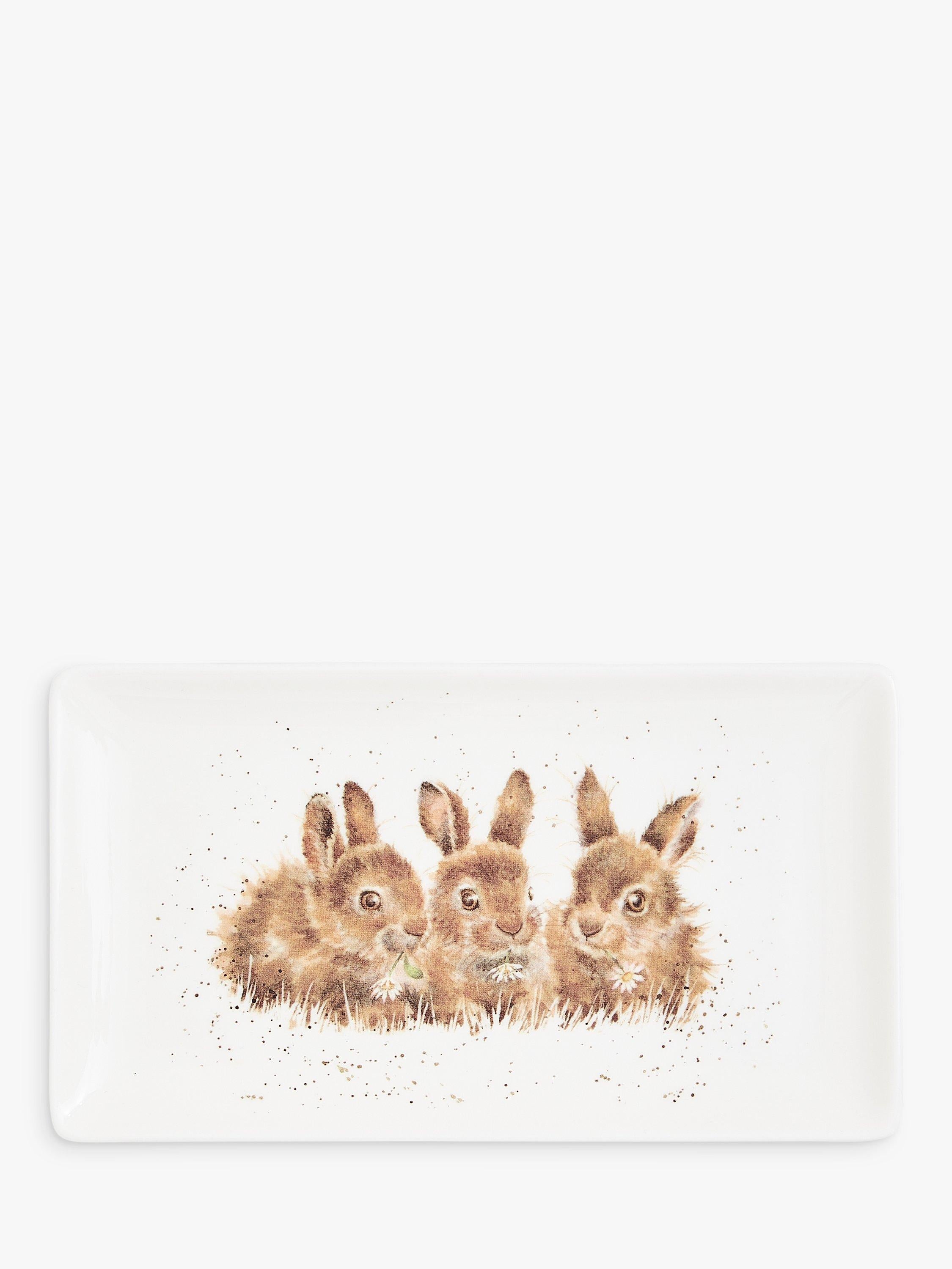 Wrendale Designs Bunnies Bone China Tray 20cm is a beautiful serving piece for your home. This decorative rectangular tray features charming rabbit artwork by Hannah Dale. Made from quality bone china, it is ideal for presenting snacks or holding small items neatly on a dresser. This tray offers versatile domestic utility and elegance.