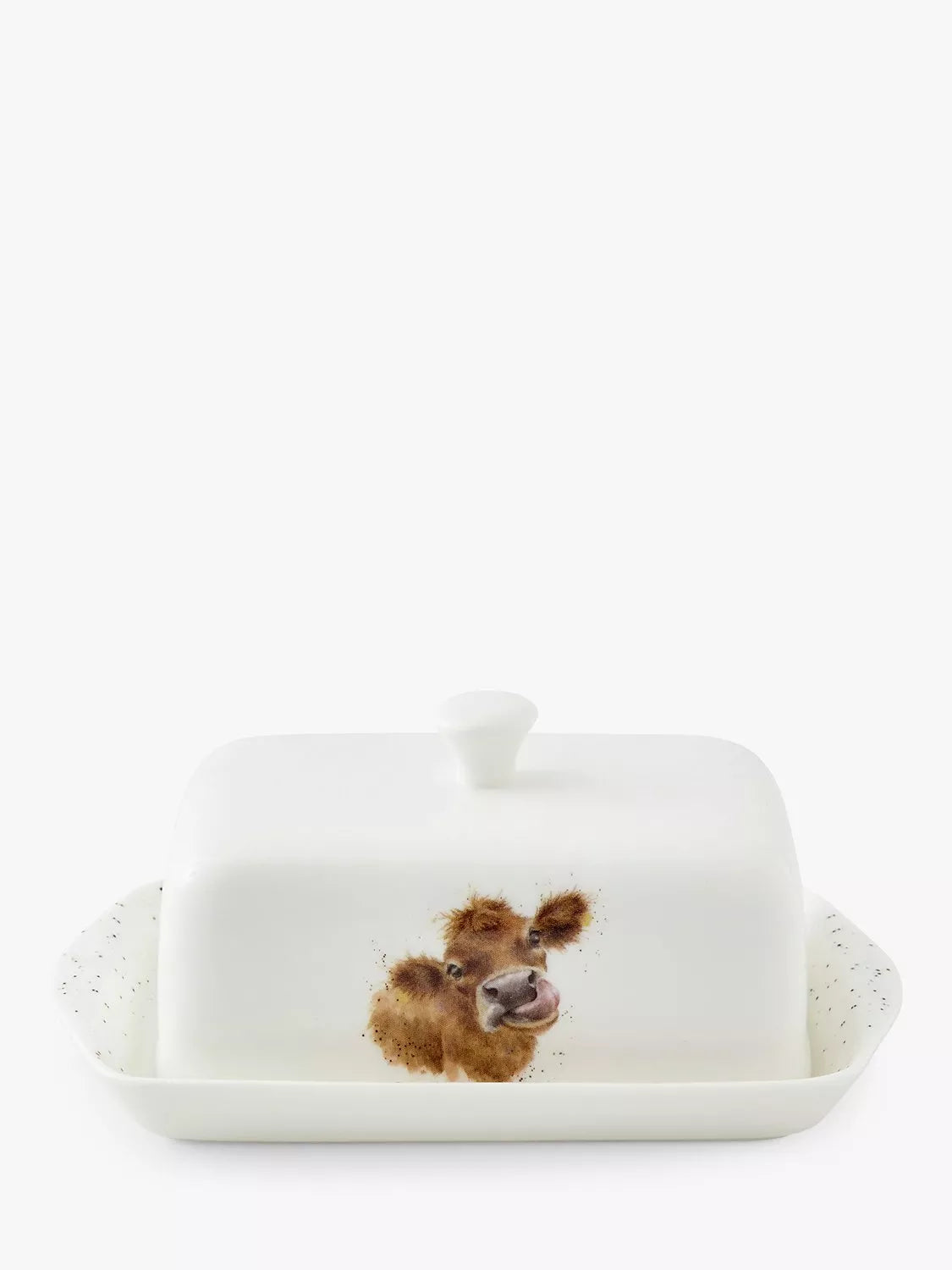 Countryside charm for your kitchen. A beautiful covered butter dish from Royal Worcester's Wrendale Designs collection. A sweet brown cow licking his nose features on the bone china dish, keeping your butter fresher for longer in adorable style. Dishwasher-safe.
