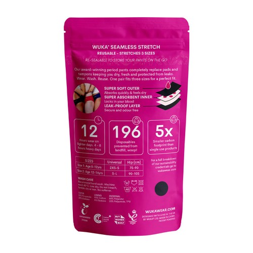 Read MoreWUKA Teen Stretch seamless period pants designed to grow with your child up to 3 sizes thanks to the unique inner gusset that expands bi-directionally for a comfortable, leak free custom fit. Teen Stretch keeps Teens dry, secure and odour-free for up to 12 hrs, or on heavy days 4-6 hours, so take a spare pair in your bag. Everyone is unique and you know your flow best. Choose from two sizes. Size 1 (age 8-12) or Size 2 (age 12-16).