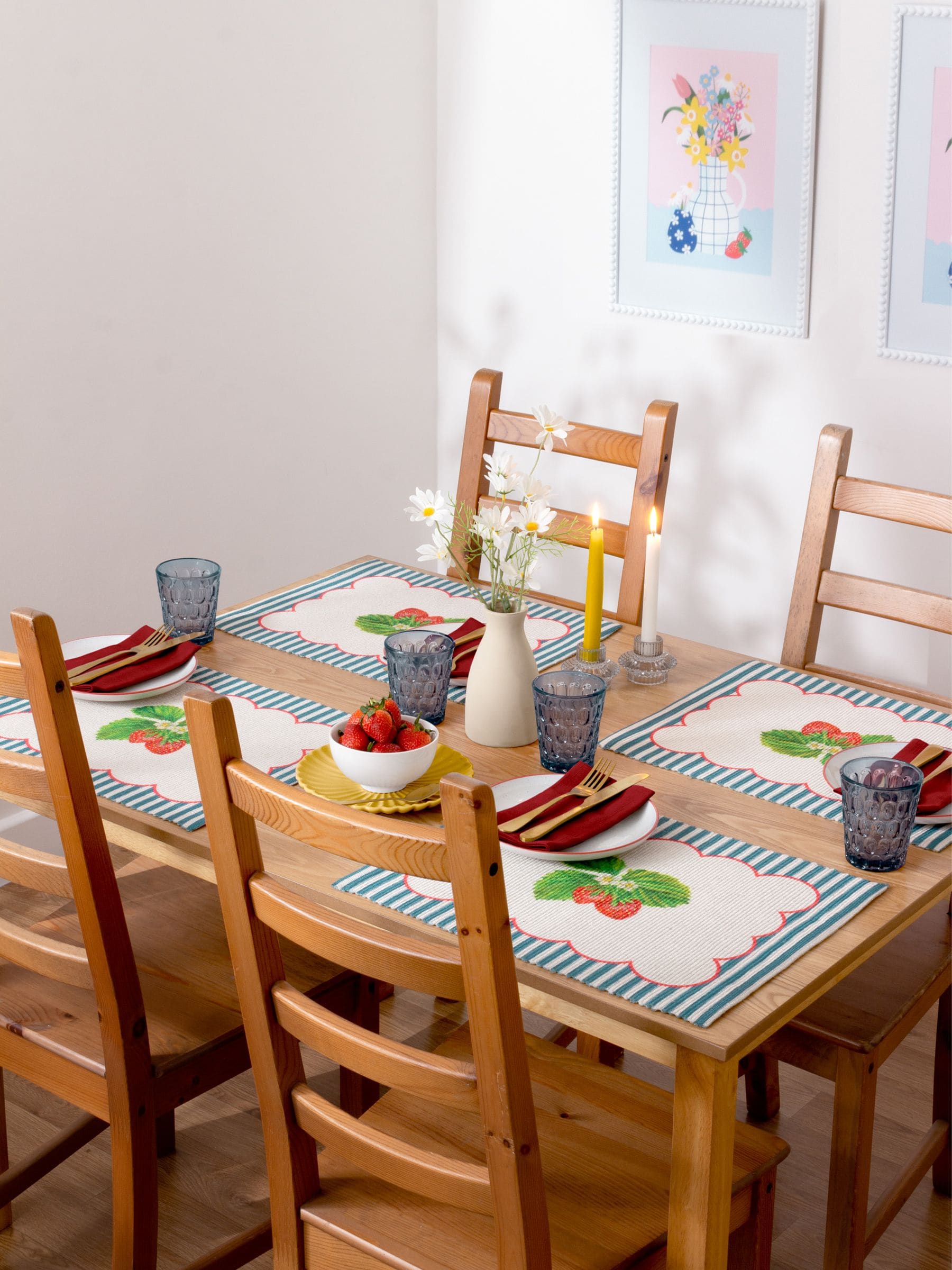 Beautifully striking and delicious, the Strawberry Stripes placemat set will certainly be the centre of attention this summer season. Featuring a digitally printed trending design of strawberries surrounded by a complementing dual-toned candy-striped border, perfect for anyone who enjoys a modern take on a classic British icon!