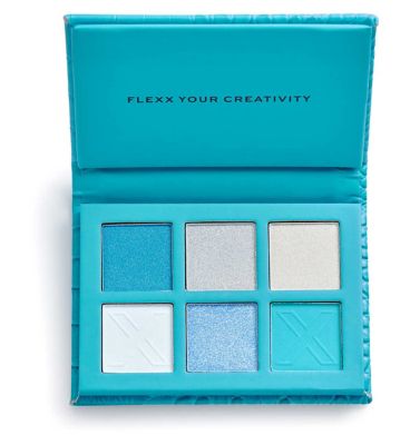 This XX Revolution Fallen Angel palette delivers six pressed powder shades housed within a vibrant, textured turquoise compact. The selection focuses on cool tones, featuring rich blues alongside shimmering silvers for dynamic makeup looks. This palette is expertly curated to encourage users to experiment freely and apply various finishes across the face for custom results.