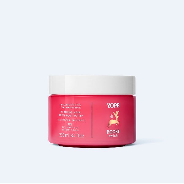 This Yope BOOST Mask provides a deep regenerating treatment formulated specifically for damaged hair. It uses natural ingredients like bioceramides and reishi adaptogen to restore hair health effectively.