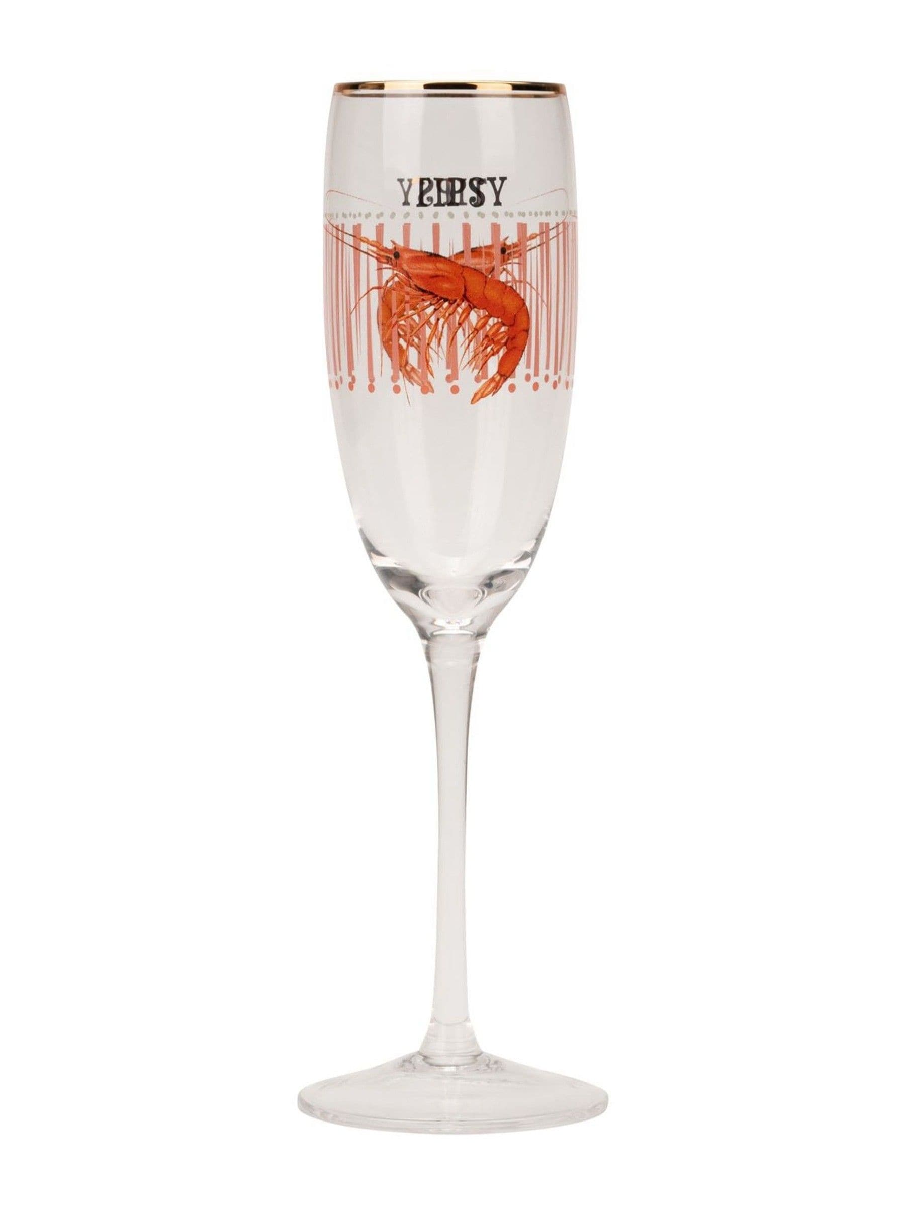 Raise a toast with the Yvonne Ellen champagne flute Shrimp, an exquisite addition to any celebration. Featuring the quirky gold coloured slogan "Tipsy" and a unique shrimp decoration, this 150ml flute is designed to stand out. Finished with a delicate gold coloured rim, it makes a thoughtful gift and adds a touch of glamour to any special moment.