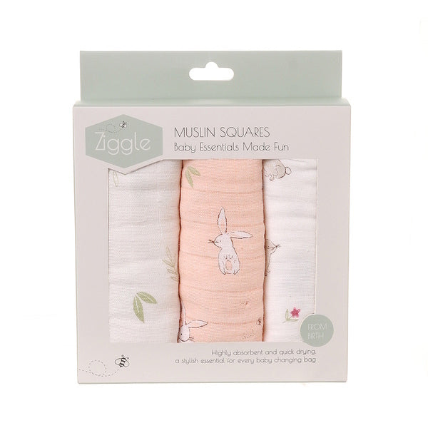 3 pack of muslin squares White & pink bunnie design 100% soft, breathable cotton Highly absorbent and quick-drying Versatile for multiple uses Large 70cm x 70cm size Machine washable and tumble dryable Every parent's best friend! This Bunnies muslin set is a must-have for daily use, offering softness, versatility, and practicality. Made from 100% pure cotton, these muslins are incredibly soft and gentle on delicate skin. Their breathable fabric ensures comfort while providing excellent absorbency, making them ideal for everyday needs. In an array of cute, soft colours and prints, these bunnies muslins bring a playful, yet soothing touch to everyday essentials. The adorable bunny designs create a visually engaging experience for your little one, making them a perfect choice for sensory development. Whether used for feeding, swaddling, or comforting, these muslins support both practicality and your baby’s early learning. They fold easily for travel and are machine washable for effortless care. Beautifully packaged in a Ziggle gift box, they make a thoughtful and practical gift for new parents. Soft, stylish, and essential—this is a must-have addition to any baby collection.