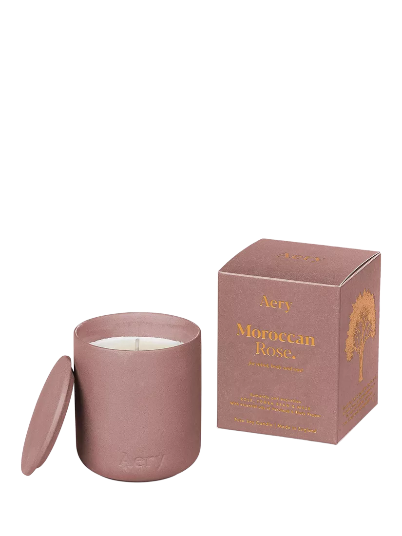 A velvety - smooth scented candle. Transporting you to early morning Morocco with a lustrously earthy rose fragrance. Giving you a feeling of being cocooned in giant silky soft rose petals. For the more design-conscious interiors. A dusky pink clay pot with a matching lid that is perfect for reusing. Full of fragrance to inspire feelings of dreamy rose gardens and freshly picked stems .280g soy wax.None