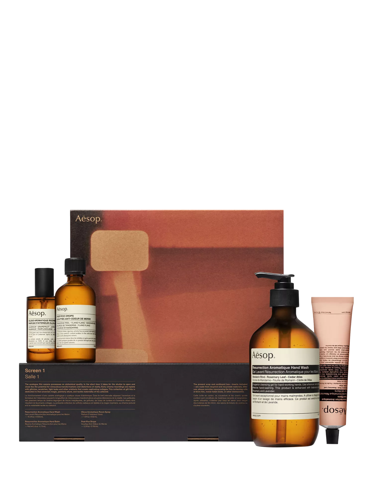The present wrap and cardboard box are made from recycled and recyclable materials. The design nods to that frequent source of Aesop's inspiration, the cinema - and more precisely the uncertain magic, painterly allure, and tactile materiality of celluloid film. After use, please consider repurposing the box for storing rolls of 8mm film, movie ticket stubs, or other memorabilia.
