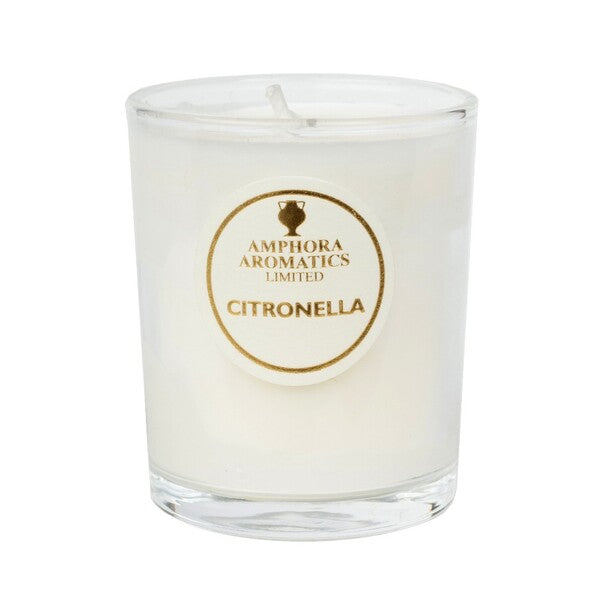 citronella 20 hr mini pot candle in an attractive recycled glass pot this strong citrus scent will banish mosquitoes and other insects in an attractive ivory colour made from pure essential oils and 100 natural plant wax wax comes from a natural sustainable plant source ideal to burn on summer evenings to repel mosquitoes and other insects our candles contain no petroleum based paraffin wax and animal products reuse the glass pot for tealights or trinkets to recycle the pot place in your normal clear glass recycle bin also available in a larger 40 hour pot size vegan friendly