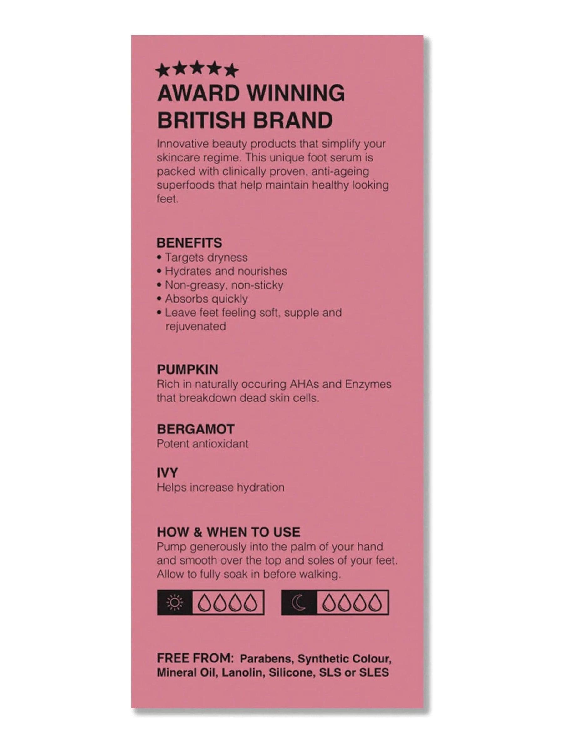 This powerful natural formula is 100% plant based, using skin benefits provided by Pumpkin, Bergamot, and Ivy to hydrate, soothe, and protect the skin on your feet. If you have noticed they have become dry or rough, this refreshing Foot Serum will help you to nourish the skin back to full health.