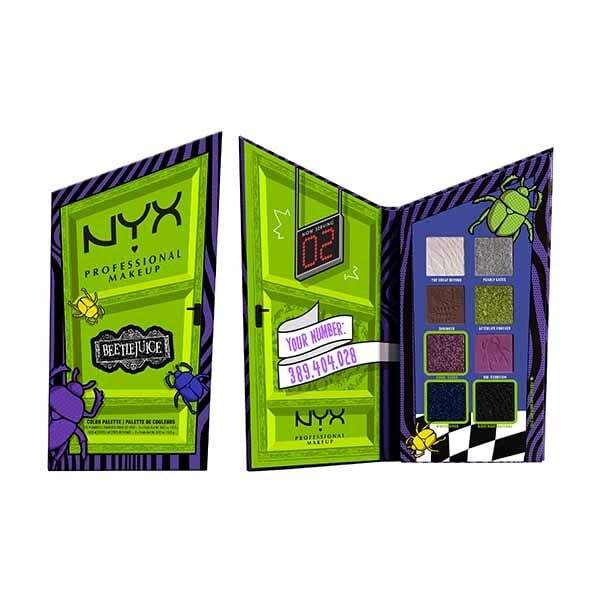 now serving color open the door to the afterlife and discover incredibly creamy pressed pigments in an 8pan palette procurated and designed to create a wide range of artistry looks in both matte and metallic finishes inspired by the new movie beetlejuice beetlejuice only in theaters electric green sparkly silver coexist in a state of perfectly colorful chaos