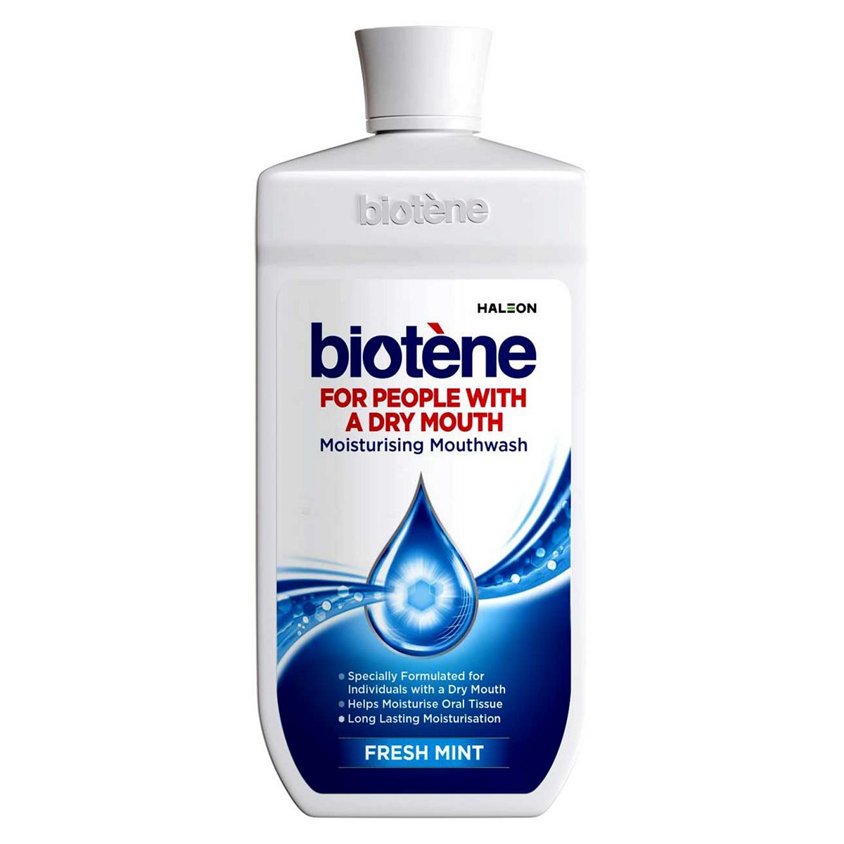 Biotène Moisturising Mouthwash helps relieve dry mouth symptoms. Dry mouth is most common in people taking multiple medications. It can also be triggered by some types of radiotherapy as well as conditions including Sjogren's syndrome and diabetes. Biotène Moisturising Mouthwash contains a mouth-moisturising system to soothe and moisturise oral tissue. Biotene moisturising mouthwash is alcohol free with a triple enzyme system that helps provide protection against dry mouth.