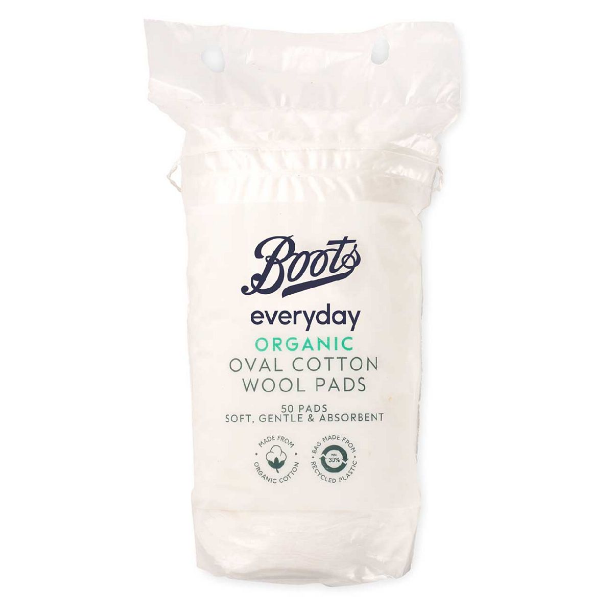 Boots Everyday Organic Oval Cotton Wool Pads 50 pads• Made from Organic Cotton• Packaging is made from 30% Recycled Plastic• Our cotton pads are Non-Fleecing