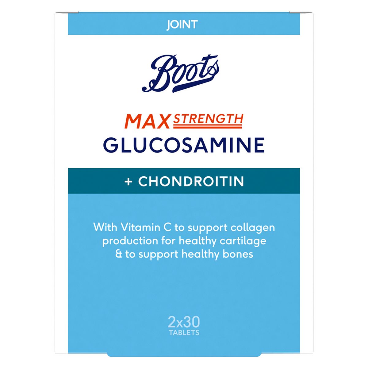 Glucosamine Sulphate 1400 mg, with Vitamin C and Chondroitin Sulphate 1200 mg Food Supplement, 30 + 30 Tablets What does it do? Combining both Glucosamine and Chondroitin together, this supplement has multiple benefits for your overall joint health. Our max strength supplement contains Vitamin C to support collagen production for healthy cartilage and also contributes to healthy bones. Free from Artificial Flavours and Preservatives. Lactose Free. Not suitable for Vegetarians.
