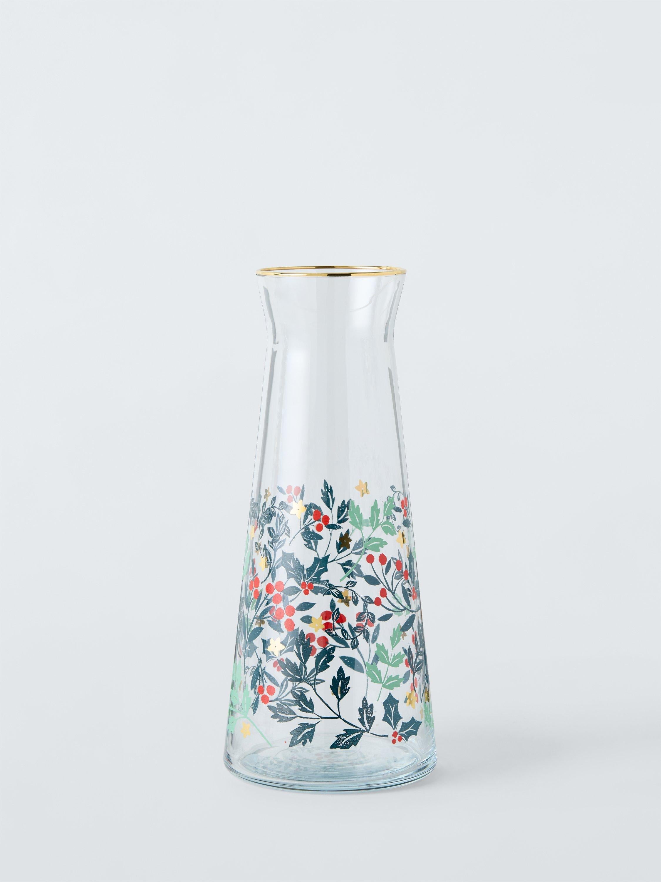 The John Lewis 1L Glass Carafe is perfect festive drinkware for seasonal gatherings. This clear carafe features an elegant gold-toned rim and detailed Christmas foliage design. It serves drinks beautifully for any special occasion, enhancing your table setting instantly.